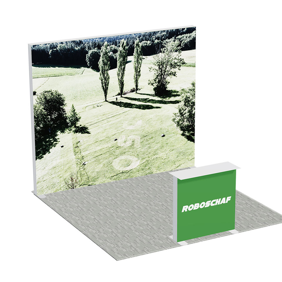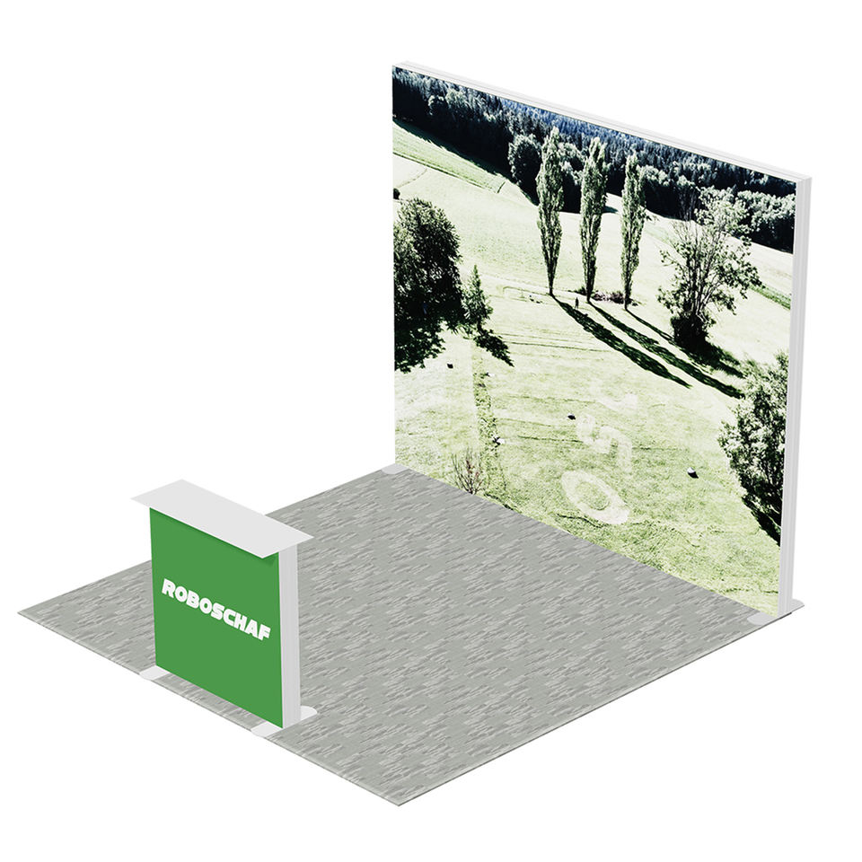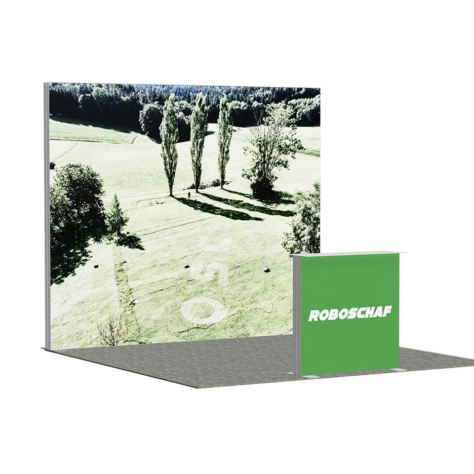 บูธแสดงสินค้าแบบโมดูลาร์ขนาด 3*3 เมตร ผนังเดี่ยวพร้อมฉากหลังลายธรรมชาติสีเขียว พร้อมเคาน์เตอร์ธีมรักษ์โลก สำหรับงานแสดงสินค้าแบบพกพา