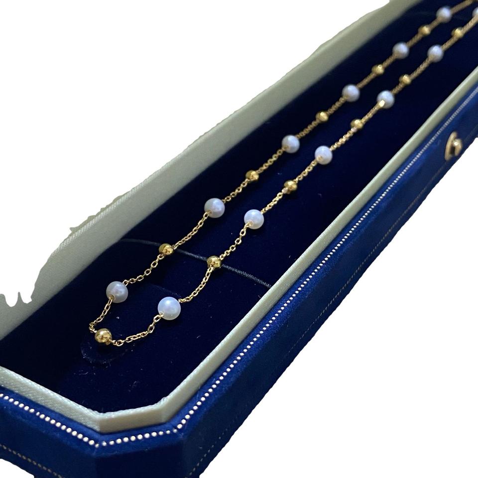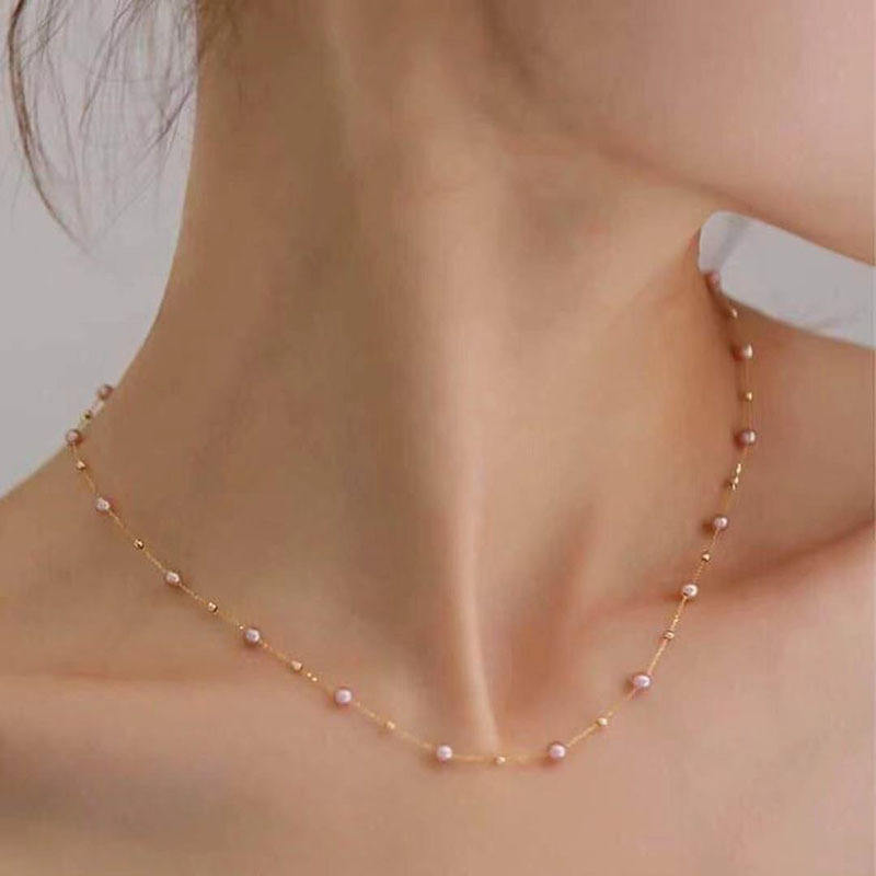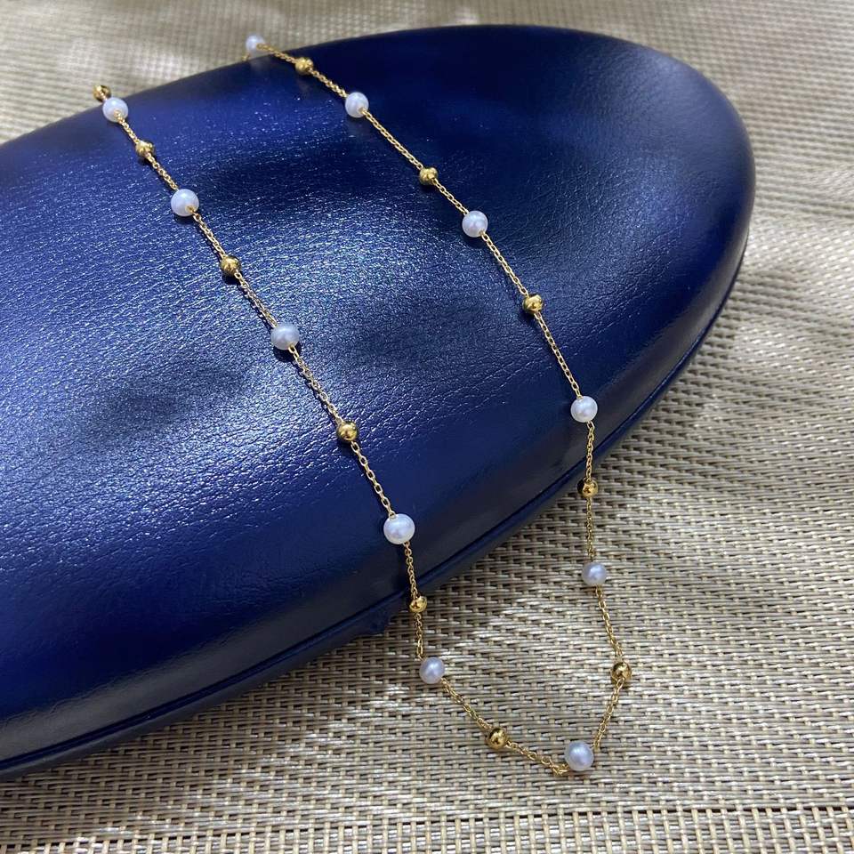 สร้อยคอมุกน้ำจืดธรรมชาติขนาด 3-4 มม. แสงเงาสวยงาม เม็ดเล็กทรงข้าว พร้อมสายคล้องคอสำหรับเด็ก