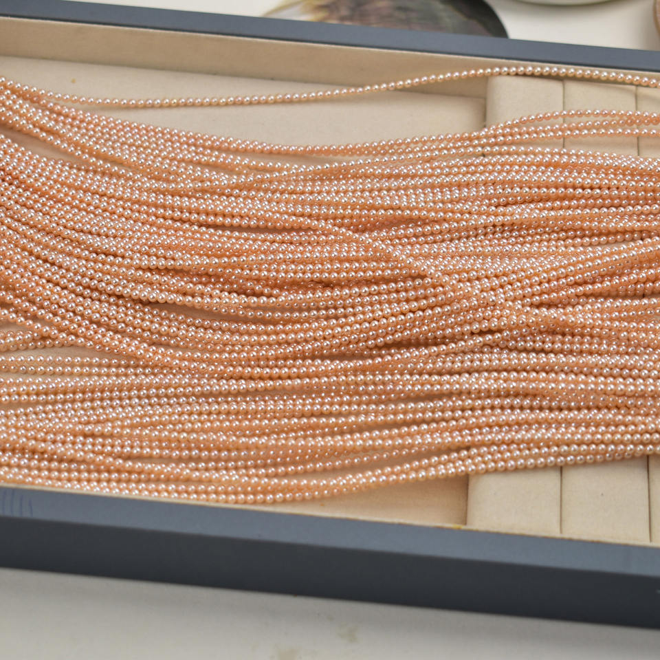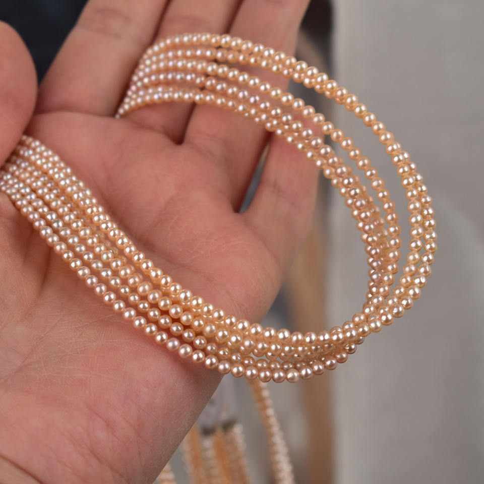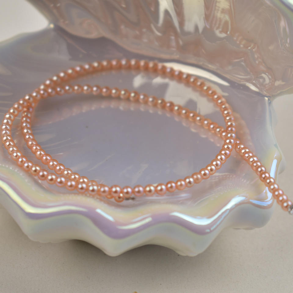 สร้อยคอไข่มุกน้ำจืดธรรมชาติขนาด 3-4 มม. แสงสว่างสวยงาม ทรงเม็ดข้าวเล็ก พร้อมสายคล้องคอ