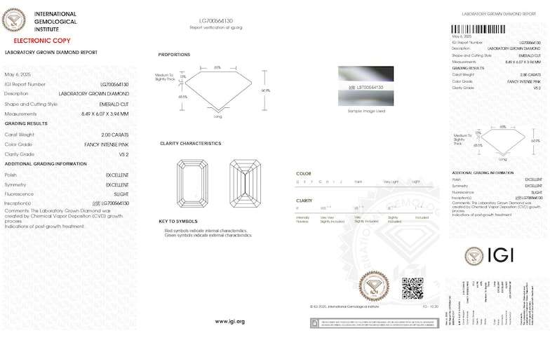 เพชรทรงเอเมอรัลด์ 3.5 กะรัต ผลิตในห้องปฏิบัติการ ได้รับการรับรองจาก IGI สีชมพูเข้มแฟนซี ความสะอาดระดับ VS สำหรับแหวน