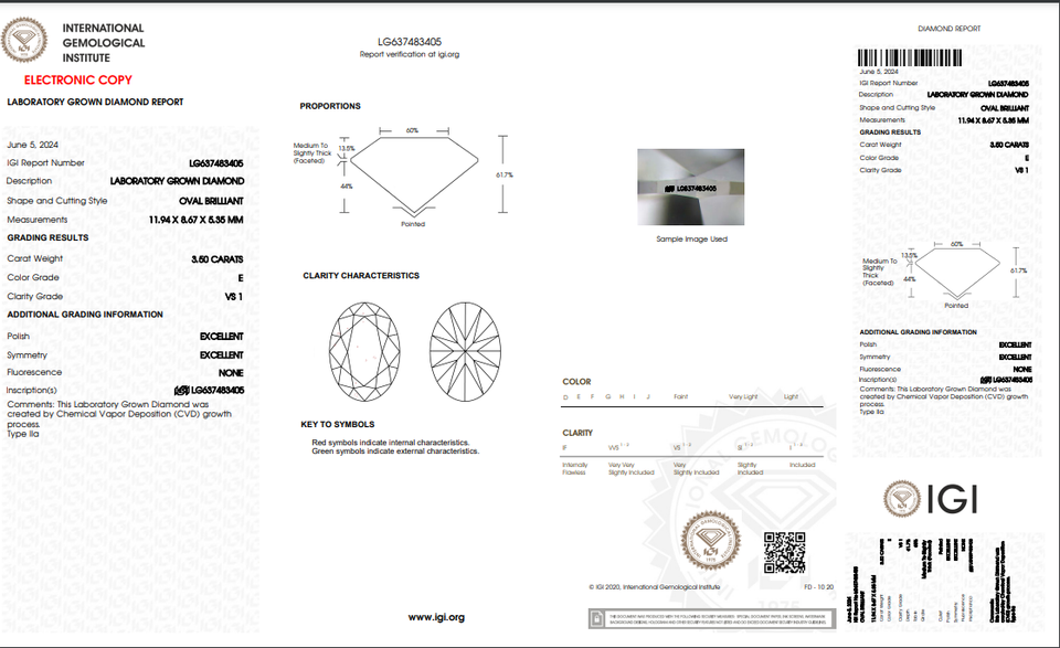 เพชรที่ปลูกในห้องปฏิบัติการทรงวงรีขนาด3.50กะรัตได้รับการรับรองว่าเป็นสี VS1ชัดเจนหินในห้องทดลอง