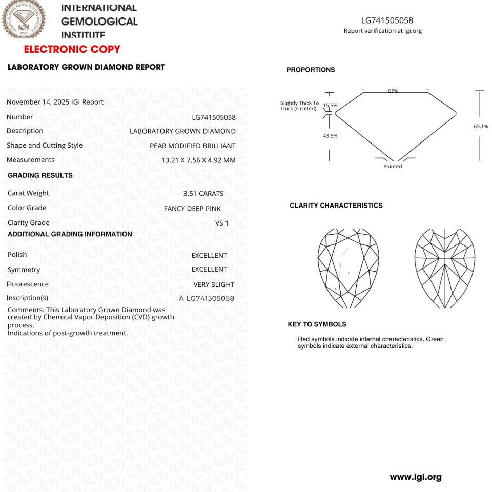 เพชรทรงลูกแพร์ 3.51 กะรัต สีชมพูเข้มแฟนซี ความสะอาดระดับ VS1 ได้รับการรับรองจาก IGI