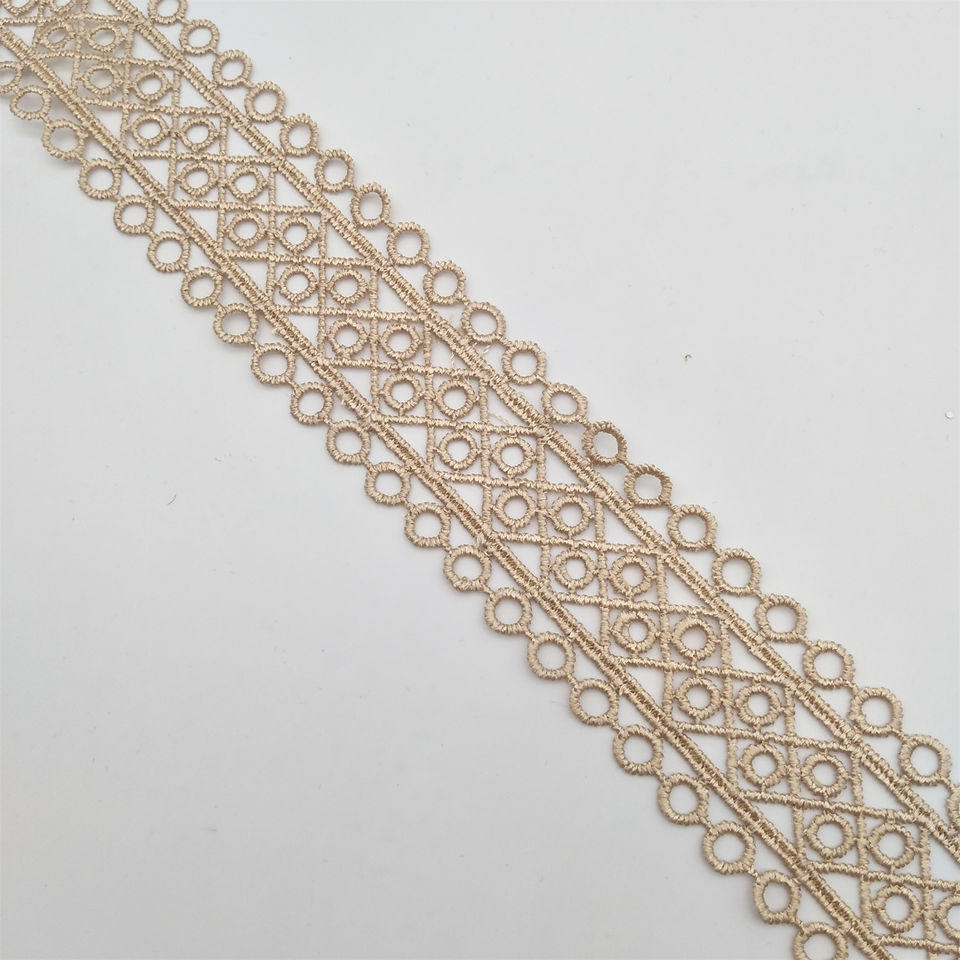 ริบบิ้นลูกไม้ปักดิ้นไหมสีทอง กว้าง 3.5 ซม. ผลิตจากโพลีเอสเตอร์ละลายน้ำได้ สำหรับตกแต่งเสื้อผ้าและของตกแต่งบ้าน