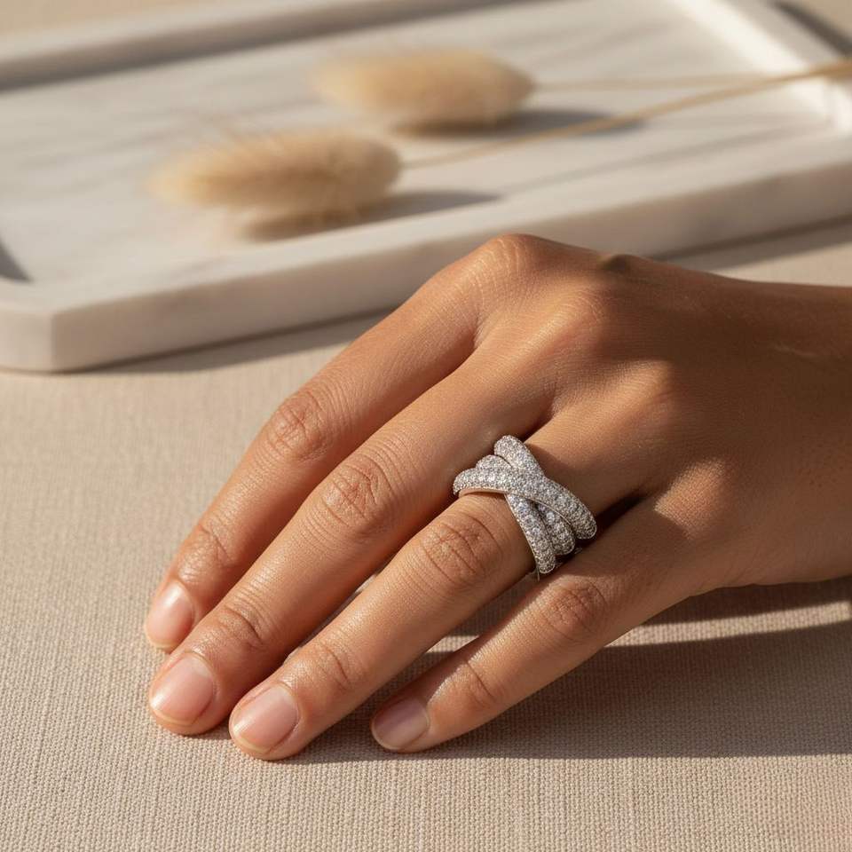 แหวนทรงกลมประดับเพชรแบบพาเว่ 3.60 กะรัต ดีไซน์ไขว้กว้าง