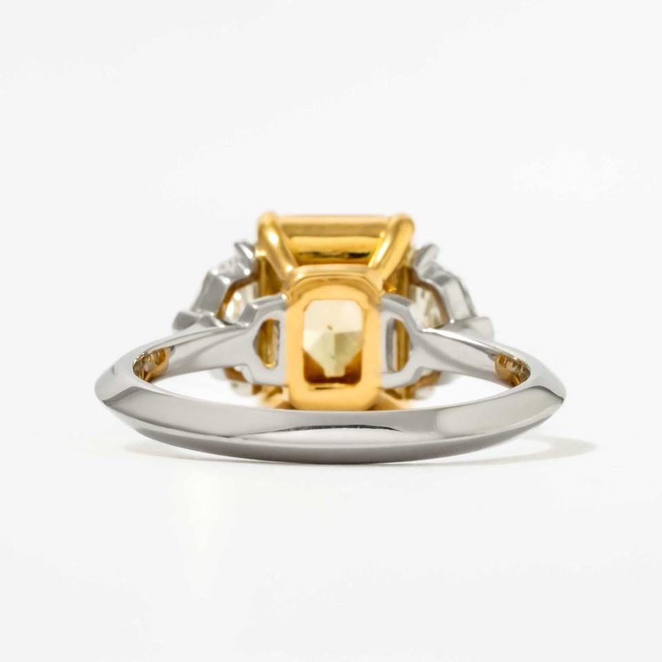 แหวนหมั้นเพชรเหลืองแฟนซีทรงเรเดียนท์คัท 3.70 กะรัต เกรด SI1 เพาะเลี้ยงในห้องปฏิบัติการ ตัวเรือนทองคำขาว 14K ประดับเพชรแบบหนามเตย ได้รับการรับรองจาก IGI