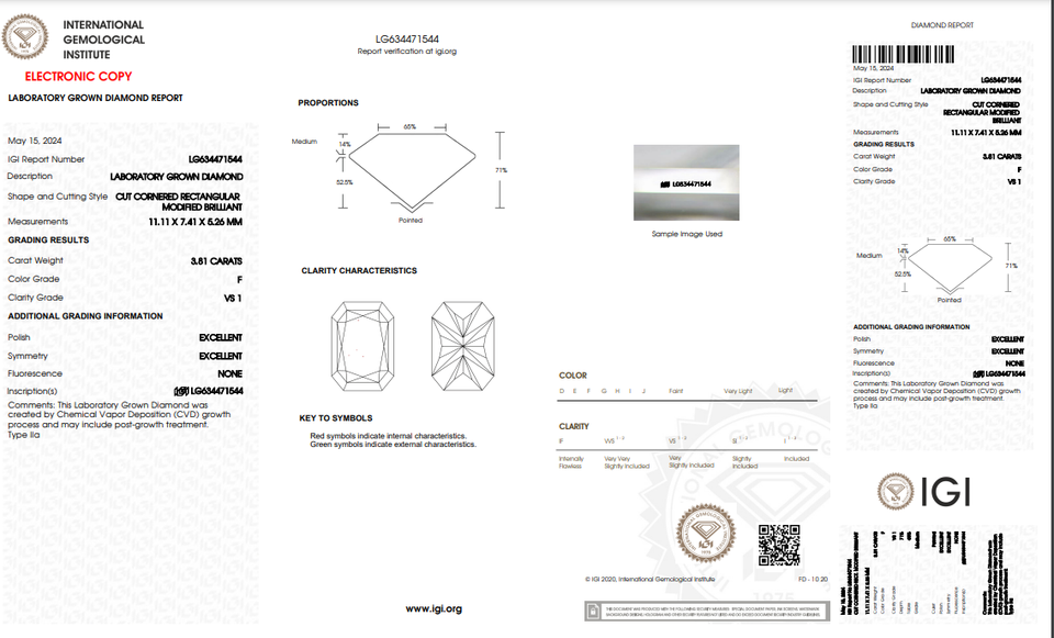 เพชรโตในห้องทดลองขนาด3.81กะรัตได้รับการรับรองว่า IGI มีความคมชัดระดับ VS1หินในห้องทดลอง