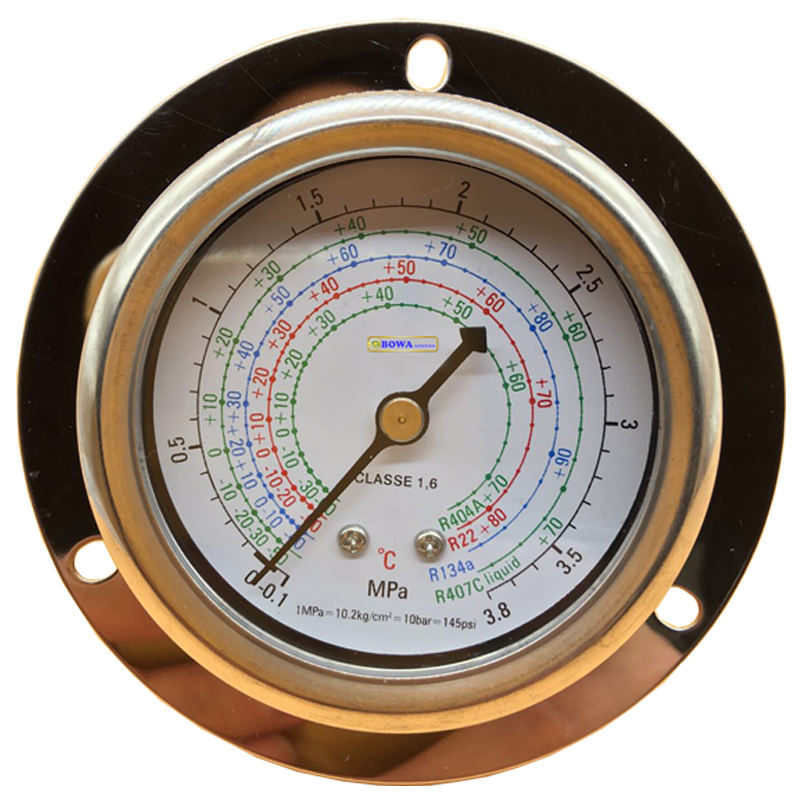 เกจวัดแรงดันแบบแกน 3.8MPa สำหรับน้ำยา R404a, R22, R134a และ R407c แสดงผลการวัดแรงดันด้านข้างและอุณหภูมิเพื่อคำนวณอัตราส่วนการระเหยและอัตราส่วนการบีบอัด