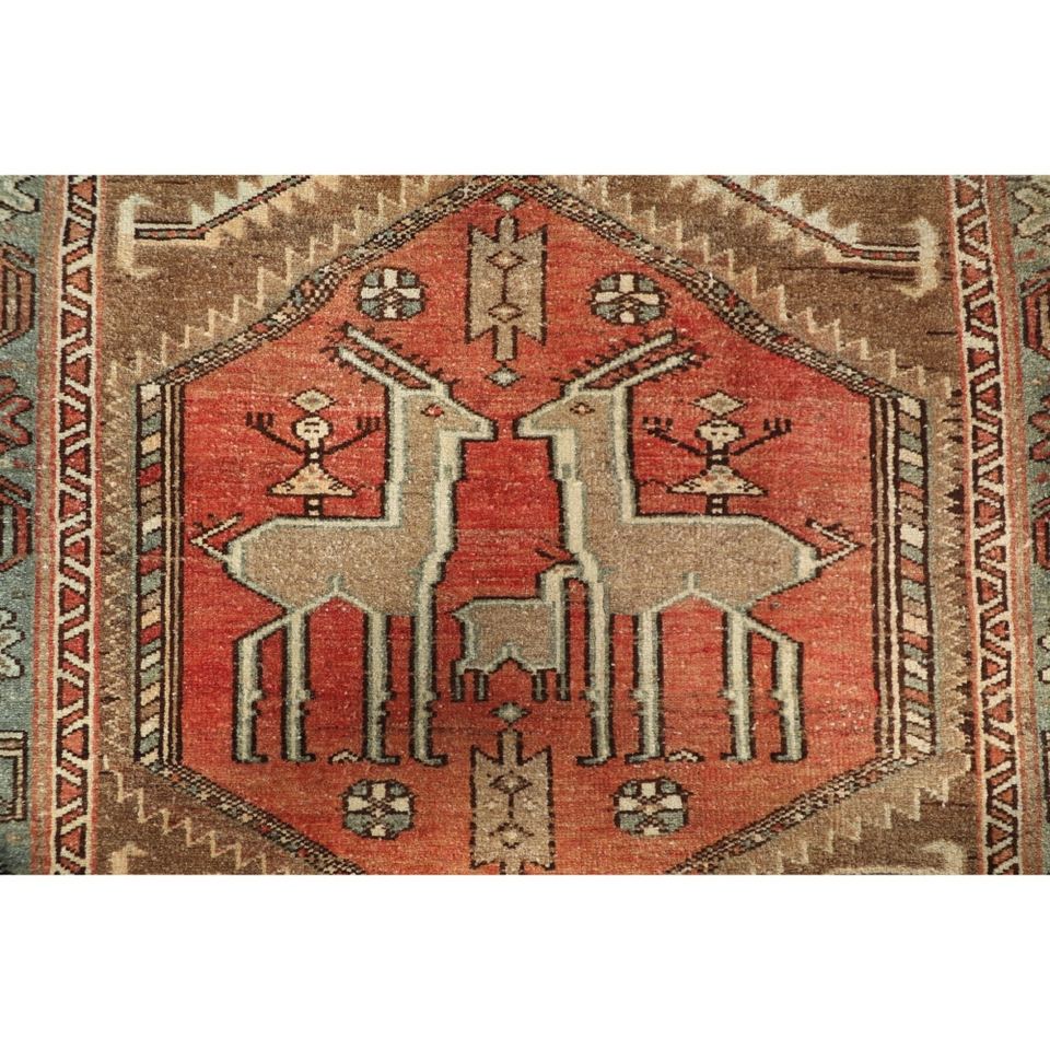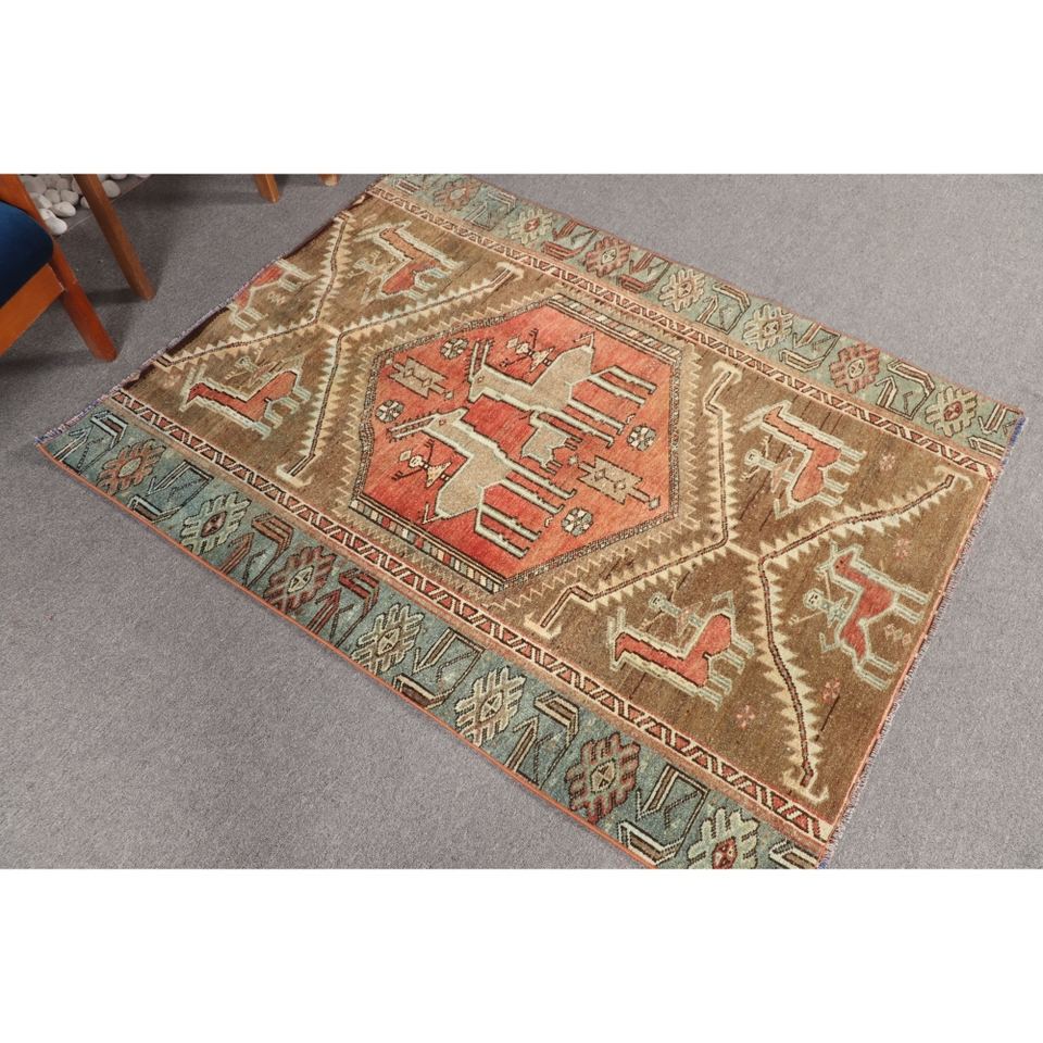 พรมวินเทจขนาดเล็ก 3.8x5.1 ฟุต สีน้ำตาลลายเรขาคณิตพร้อมลายสัตว์ พรมตุรกี