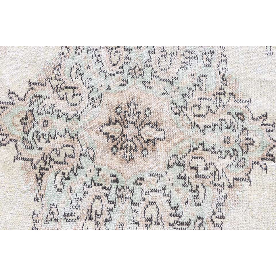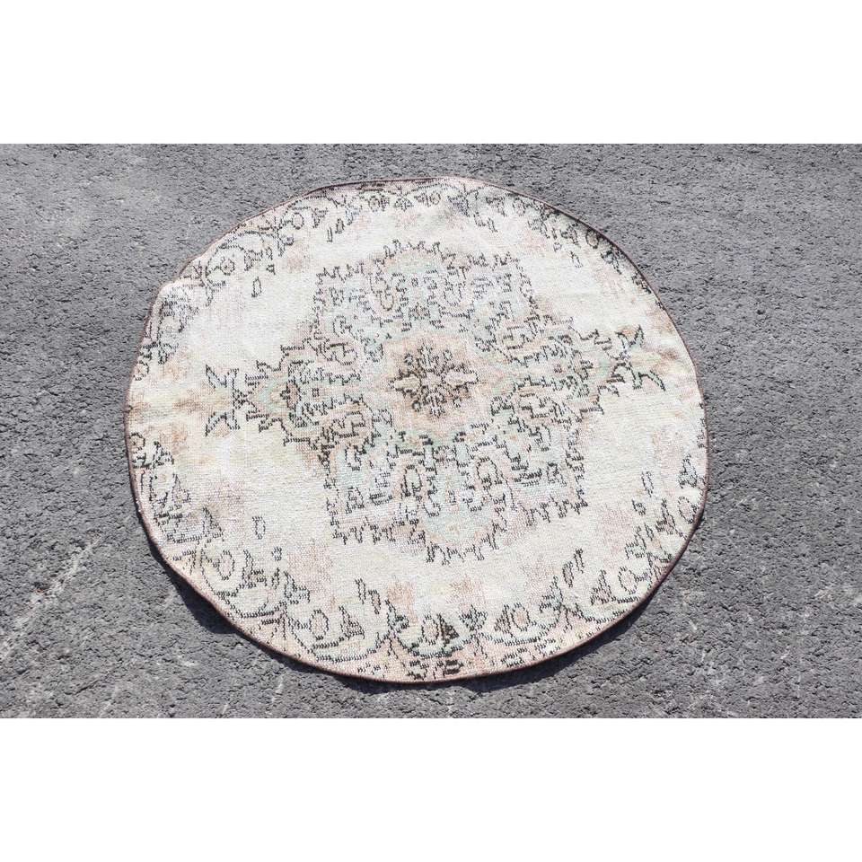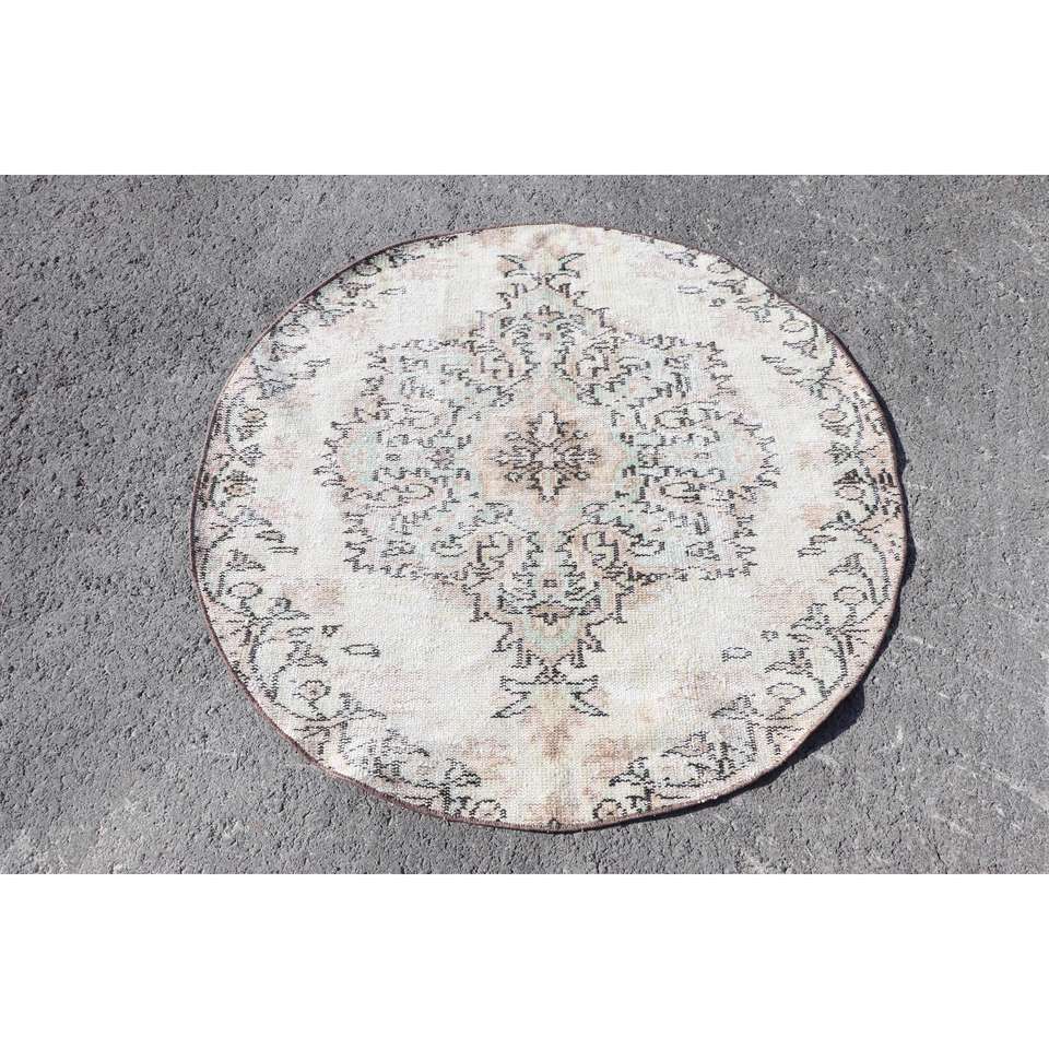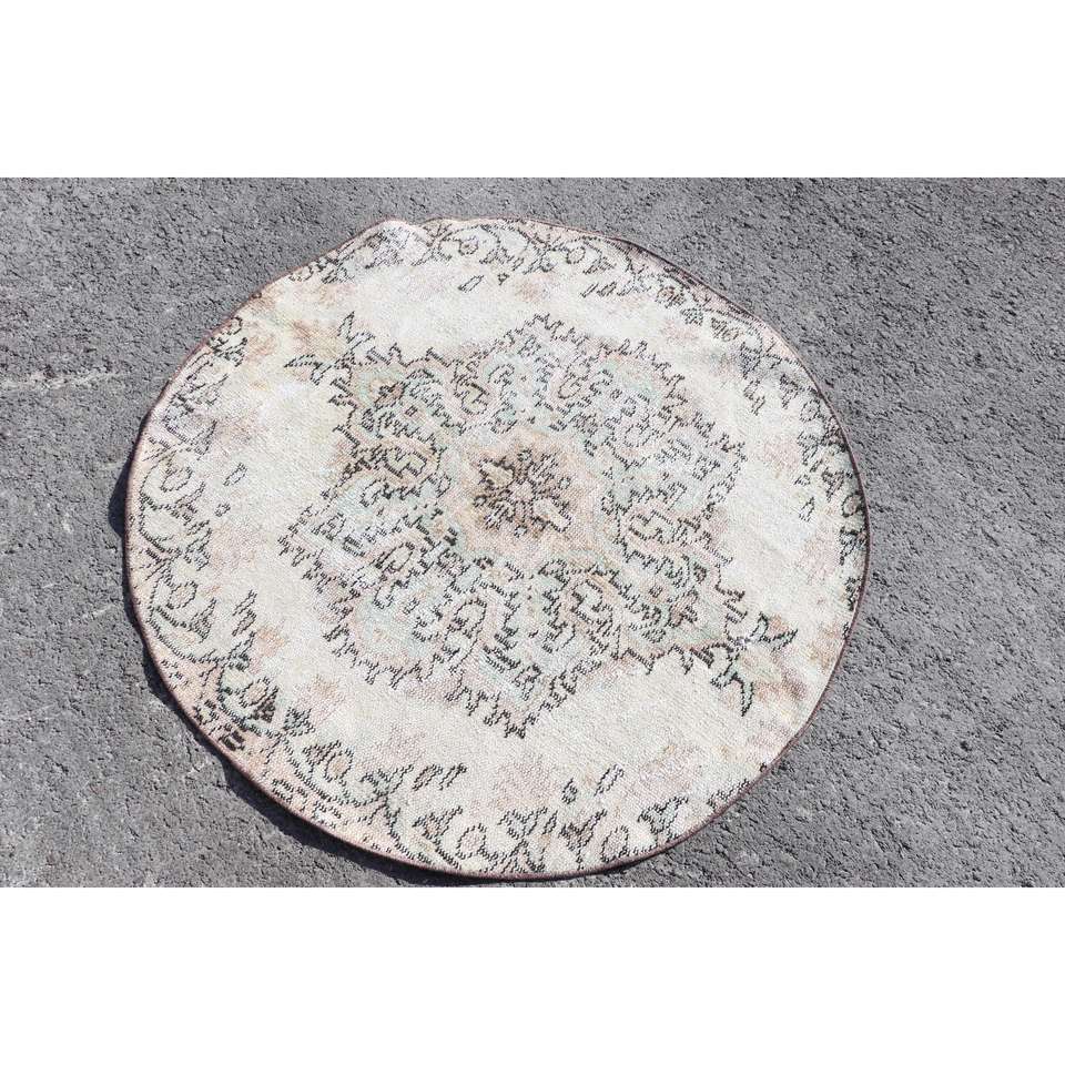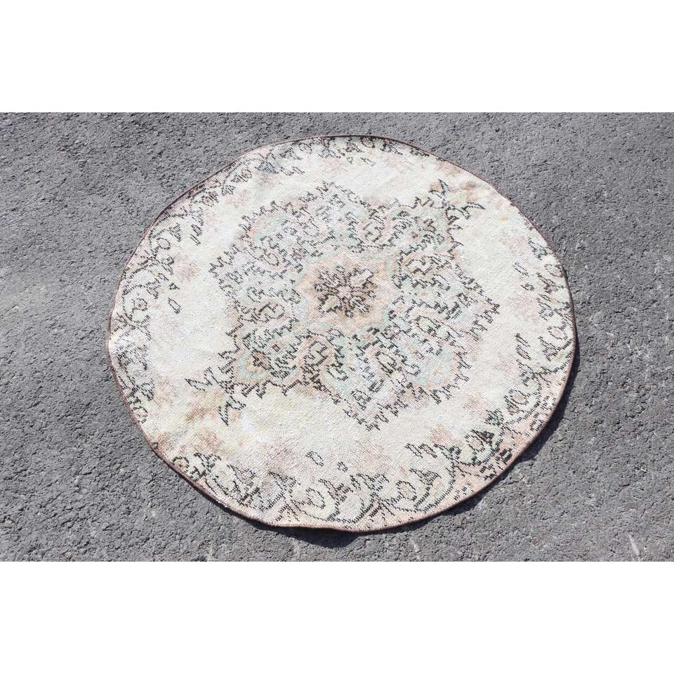 พรมปูพื้นสไตล์วินเทจลายตะวันออกสีขาวแบบตุรกี ขนาด 3.9x3.9 ฟุต ทำจากขนสัตว์แบบแพทช์เวิร์ค พร้อมแผ่นรองหลังทำจากยางพารา เป็นมิตรต่อสิ่งแวดล้อม เหมาะสำหรับตกแต่งบ้าน