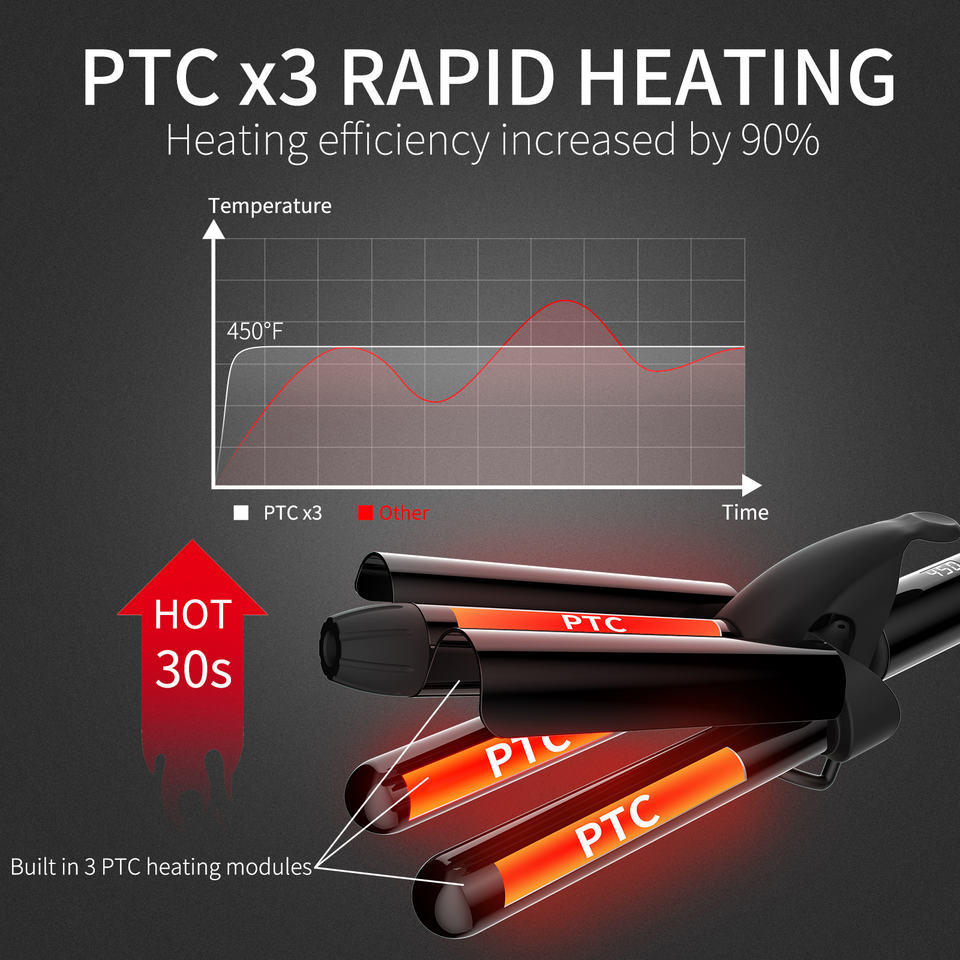 เครื่องม้วนผมเซรามิก 3 บาร์เรล รุ่น Mermaid Waver ขนาด 22 มม. พร้อมฮีตเตอร์ PTC หน้าจอแสดงอุณหภูมิ LED ได้รับการรับรองมาตรฐาน ROHS ใช้งานได้ยาวนาน