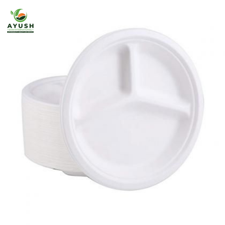 3-Compartment 12 Inch Bagasse Plates made of Sugarcane Pulp High Volume Meal Delivery and Restaurant Takeaway