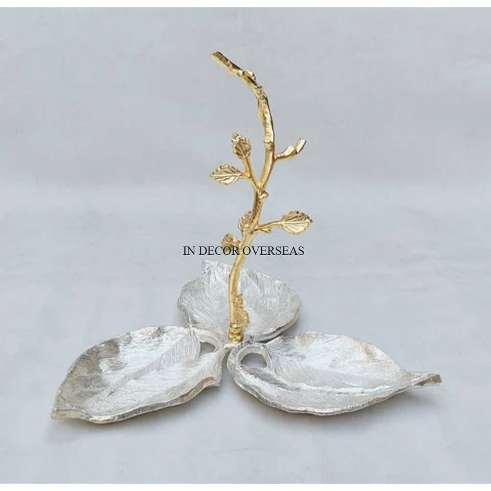 ชามดีไซน์เนอร์เคลือบเงาสีเงินเคลือบอลูมิเนียม3ช่องพร้อมดอกบัวชุบทอง
