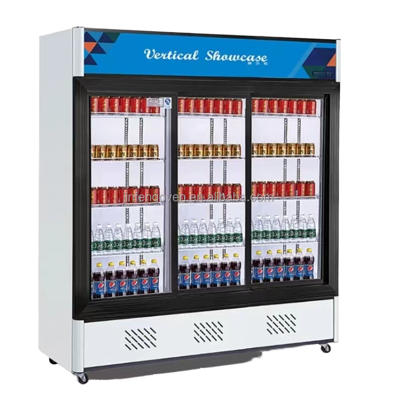 ตู้แช่เย็นแบบแสดงสินค้า 3 ประตู ระบบทำความเย็นโดยตรง แบบสองอุณหภูมิ พร้อมประตูกระจกและชั้นวาง 12 ชั้น / ตู้แช่เครื่องดื่ม