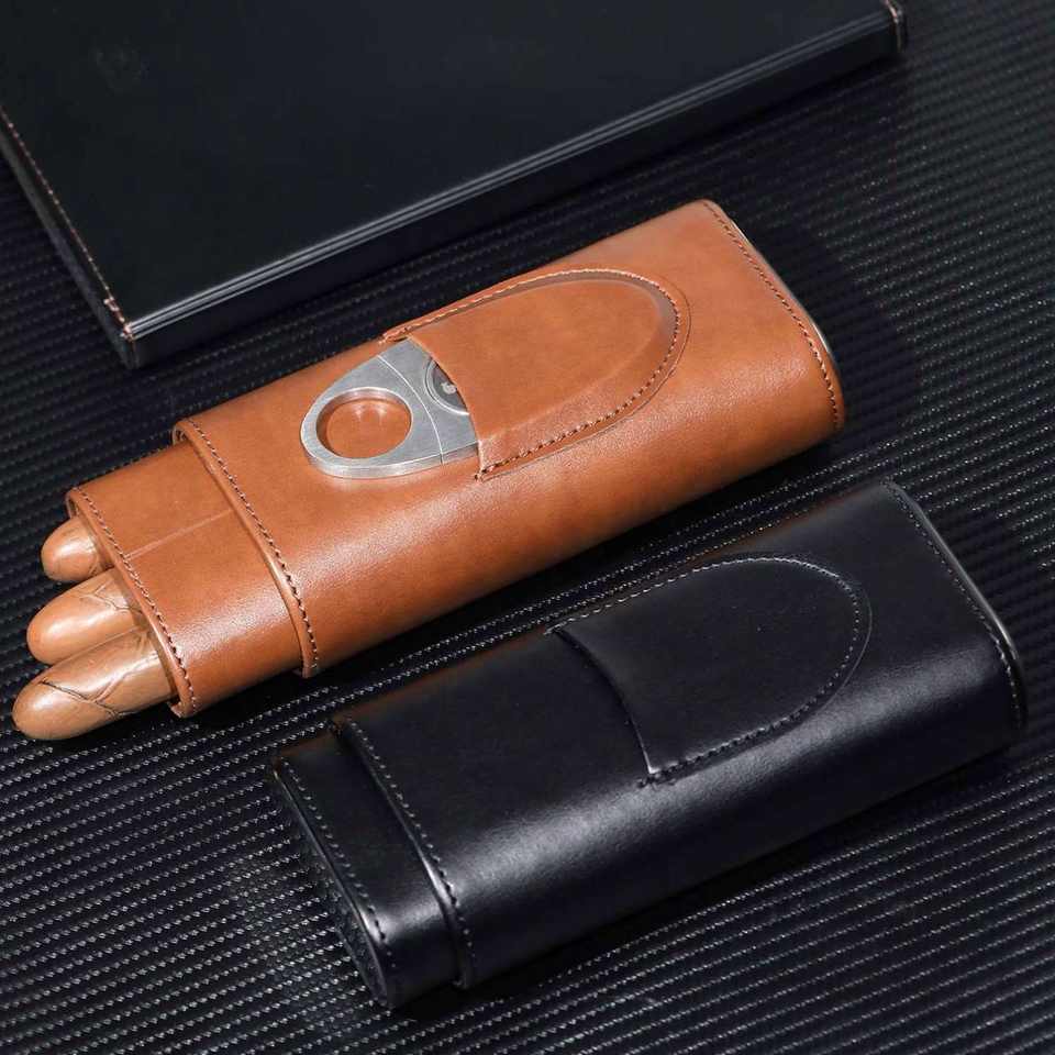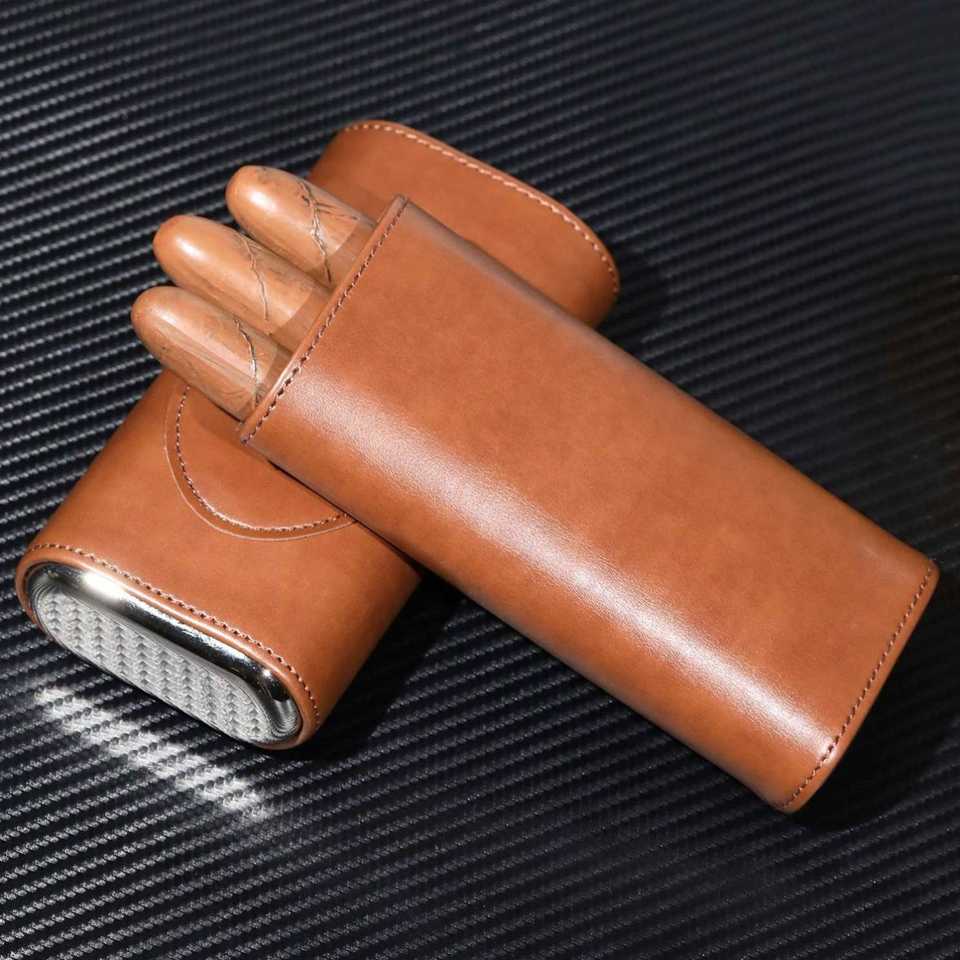 กล่องใส่ซิการ์หนังสีน้ำตาล 3 นิ้ว พร้อมช่องบุไม้ซีดาร์และที่ตัดซิการ์สแตนเลสสีเงิน พร้อมโลโก้สั่งทำ