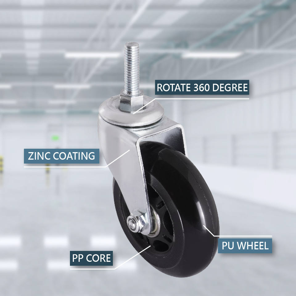 ล้อเลื่อนขนาด 3 นิ้ว แกน M8 x 1 นิ้ว แบบหมุนได้ ล้อ PU เรียบลื่น โครงสร้างเหล็กและโพลีโพรพิลีน