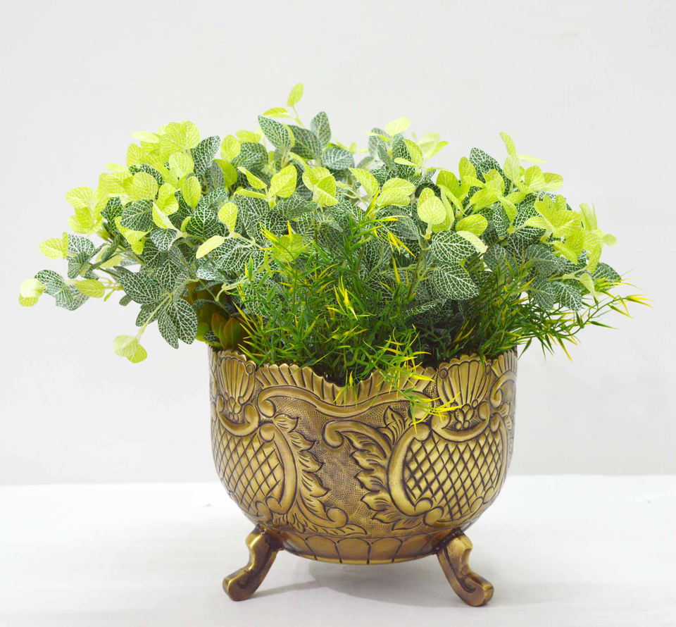 แจกันดอกไม้โบราณ ทองเหลืองลายดอกไม้ อลูมิเนียมปั๊มนูน