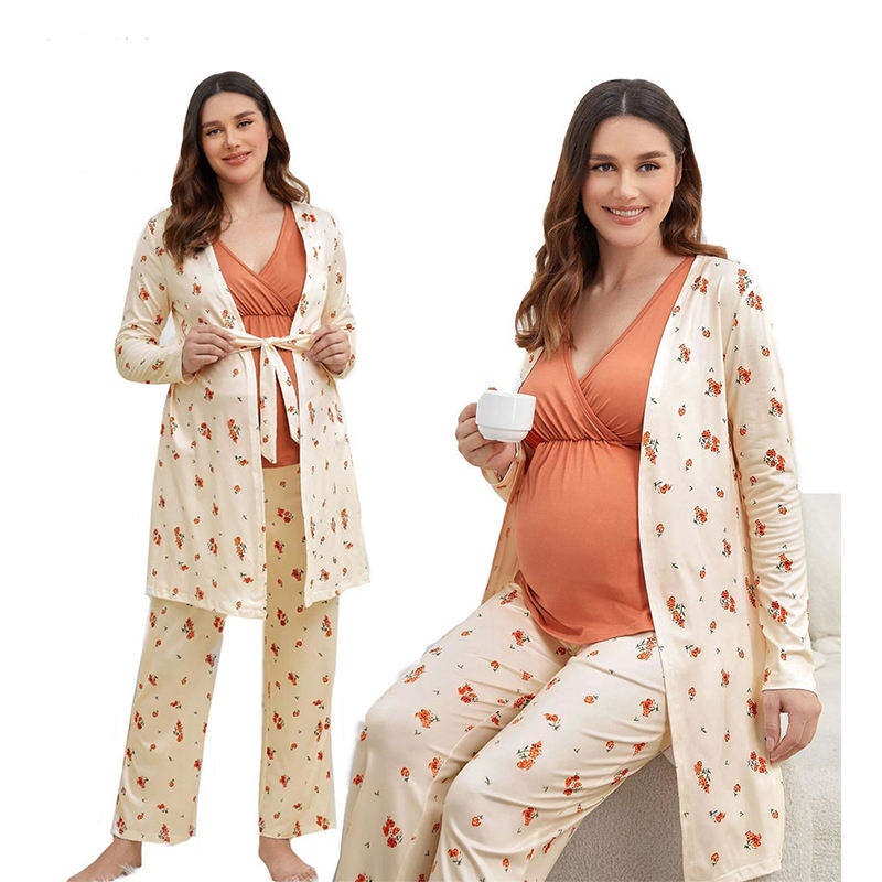 ชุดคลุมให้นมบุตรแบบกำหนดเอง 3 ชิ้น เสื้อคลุมคนท้องแขนยาว ผ้าโมดอลคอตตอน ชุดนอนคนท้อง ชุดคลุมให้นมบุตร