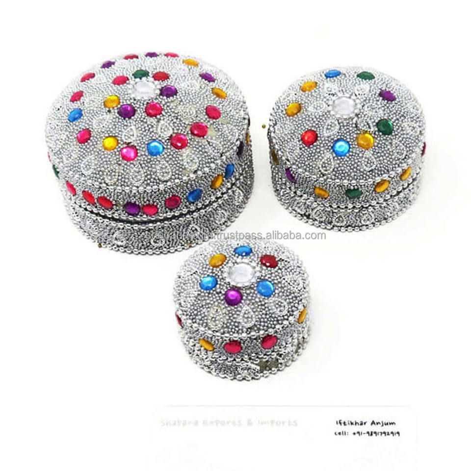 ชุดกล่องใส่เครื่องประดับแบบพกพา 3 ชิ้น กล่องเก็บของอเนกประสงค์ทำมือจากอินเดีย กล่องใส่ยาเม็ดทรงกลมประดับลูกปัด ทำจากอะลูมิเนียม สำหรับใช้ในชีวิตประจำวัน