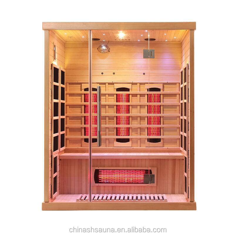 ห้องซาวน่าอินฟราเรดแบบเต็มสเปกตรัมสำหรับ 3 คน ทำจากไม้เนื้อแข็ง พร้อมแผงควบคุมด้วยคอมพิวเตอร์และหน้าต่างบนหลังคา ดีไซน์ทันสมัย