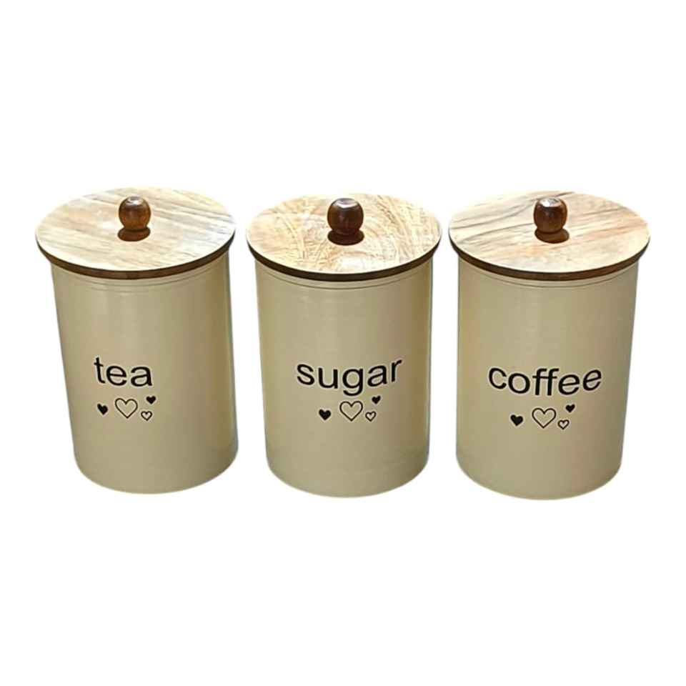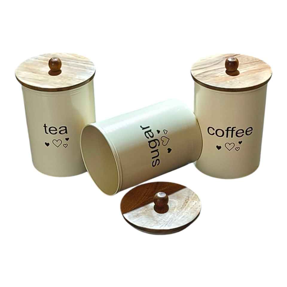 ชุดกระป๋องเก็บน้ำตาล กาแฟ ชา 3 ชิ้น ทำจากโลหะและไม้ เป็นมิตรกับสิ่งแวดล้อม ปิดสนิท พร้อมฝาปิดตกแต่ง สำหรับใช้ในครัว