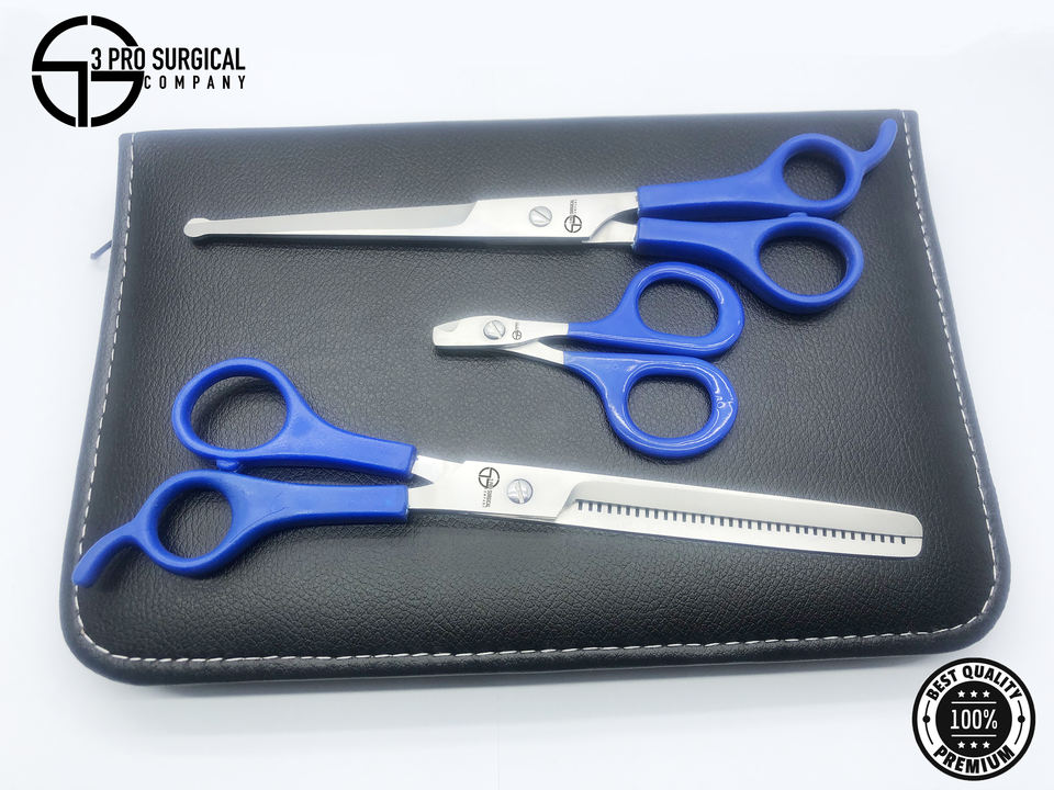 ชุดกรรไกรเสริมสวยสแตนเลสสำหรับสัตว์เลี้ยง3ชิ้นอุปกรณ์ผ่าตัดสำหรับมืออาชีพด้ามจับสแตนเลสคมสวยผอมบางมือขวา