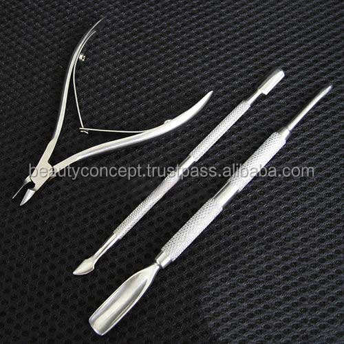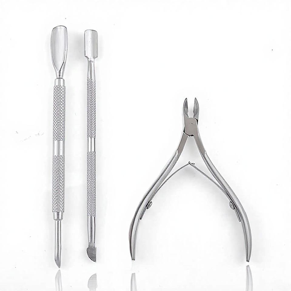 ชุดตัดเล็บมืออาชีพ 3 ชิ้น ทำจากสแตนเลสสตีล ด้ามจับยาวสองด้าน พร้อมที่ตัดหนังกำพร้า ช้อนดันหนัง และที่ตัดเล็บ
