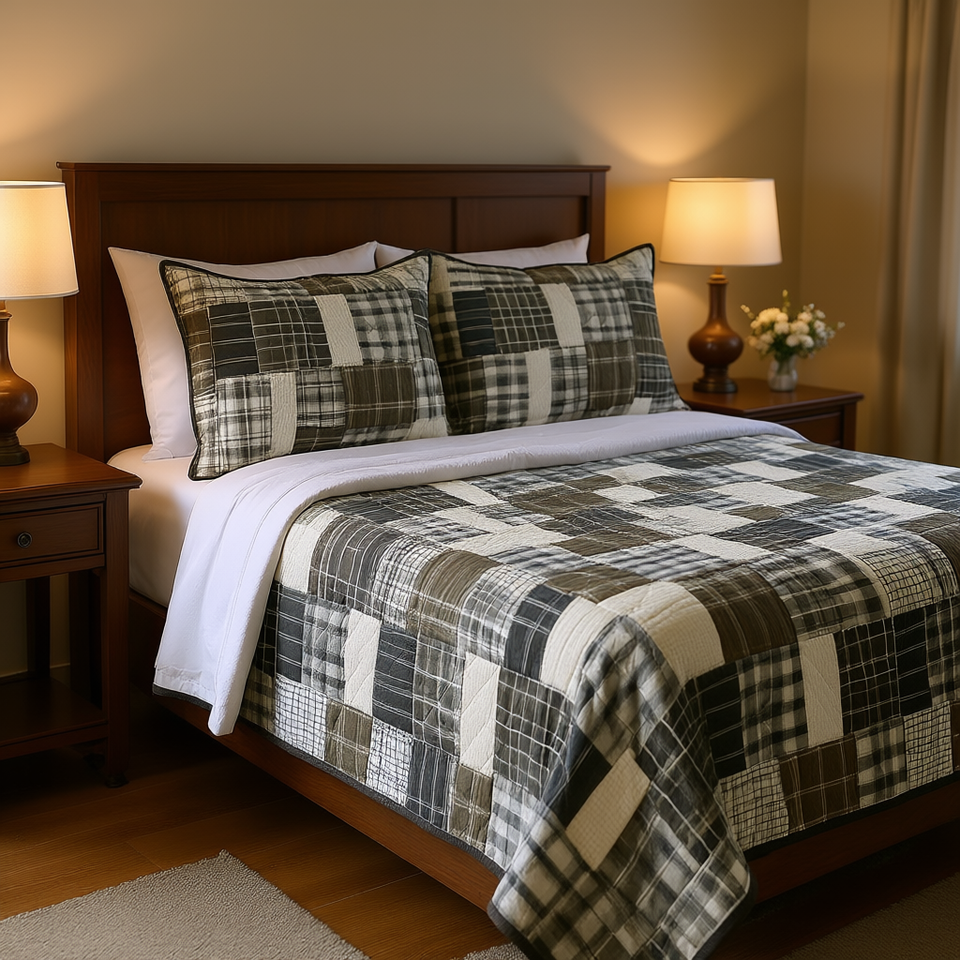 ชุดผ้านวม 3 ชิ้น แบบกลับด้านได้ สีดำน้ำตาล ลายดอกไม้สไตล์วินเทจ ขนาดควีนไซส์ ไส้ใยฝ้าย สำหรับใช้ในโรงแรม เย็บมือแบบแพทช์เวิร์ค