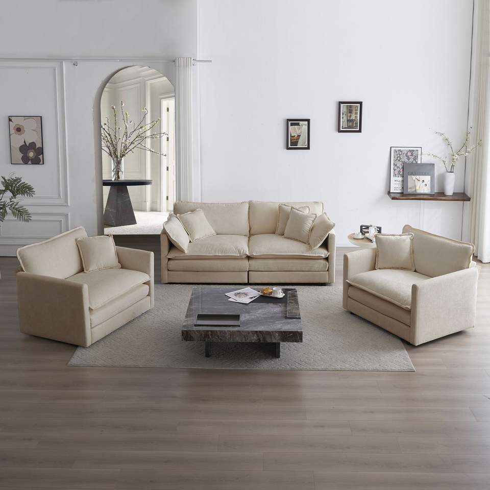 ชุดห้องนั่งเล่นประหยัดพื้นที่ 3 ชิ้น ประกอบด้วยเก้าอี้มีพนักแขน 2 ตัว และโซฟา 2 ที่นั่ง พร้อมหมอนอิงและหมอนข้าง โดย Ca