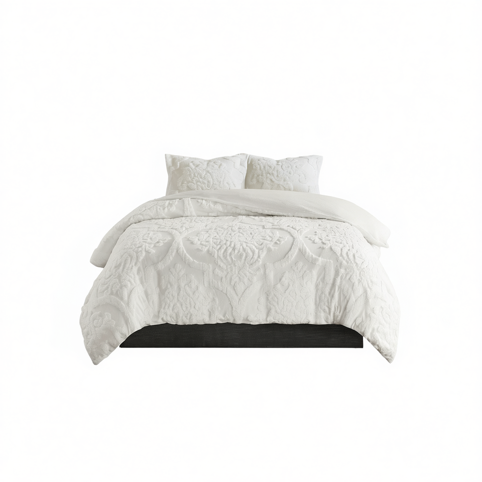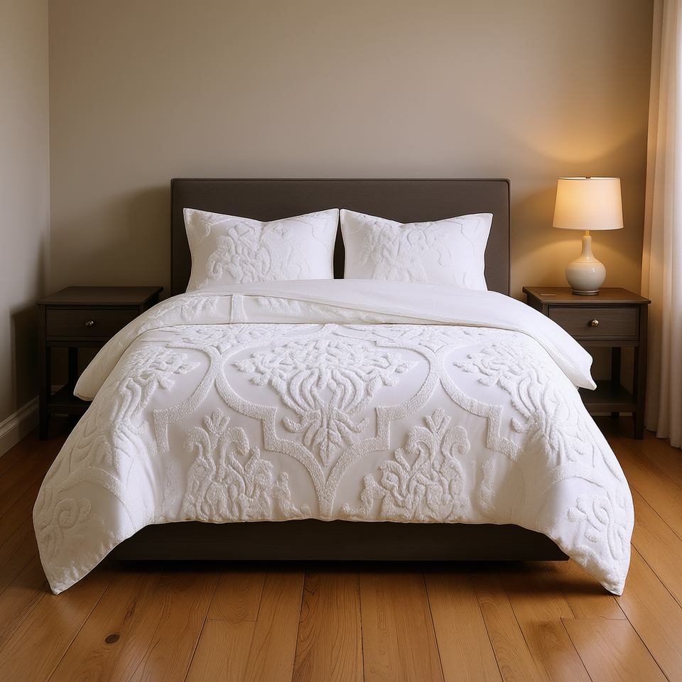 ชุดผ้าห่มนวมลายดามัสก์ผ้าฝ้ายเชนิลล์แบบมีปุ่ม 3 ชิ้น ชุดเครื่องนอนแบบคลาสสิกสำหรับใช้ในบ้าน สีขาว