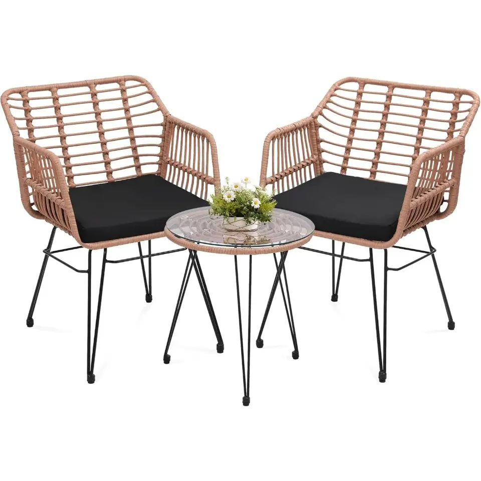 ชุดเฟอร์นิเจอร์ระเบียงหวาย3ชิ้นเก้าอี้หวาย2ชิ้นและโต๊ะกระจกพร้อมเบาะรองนั่งสวนที่ทนทานต่อทุกสภาพอากาศ