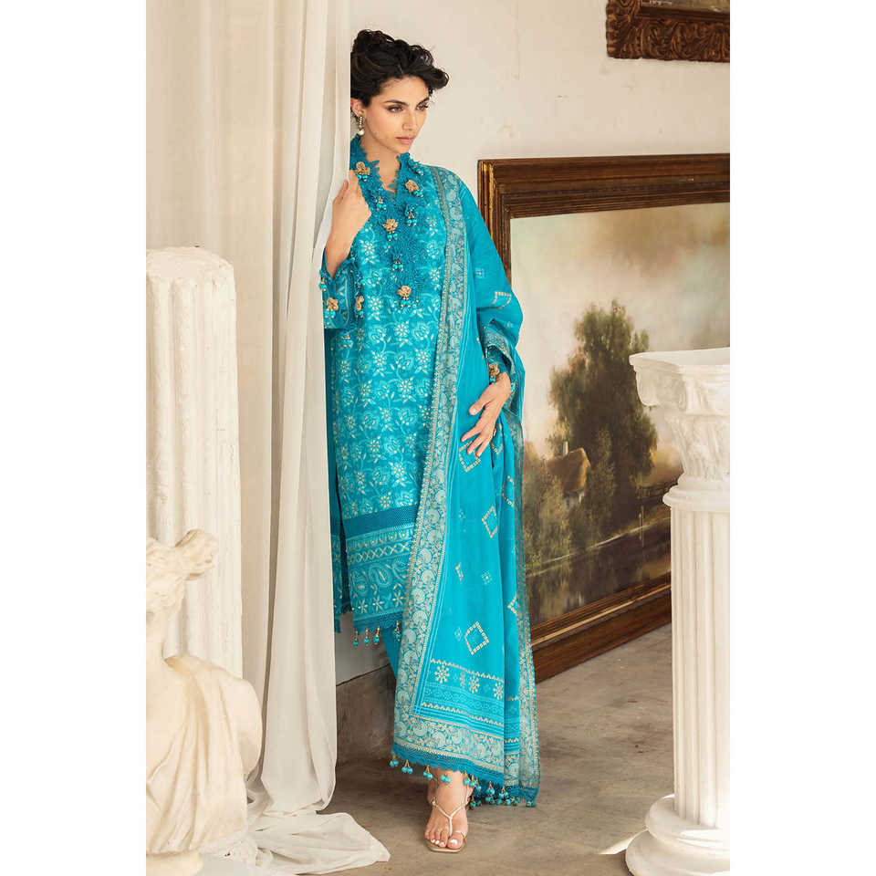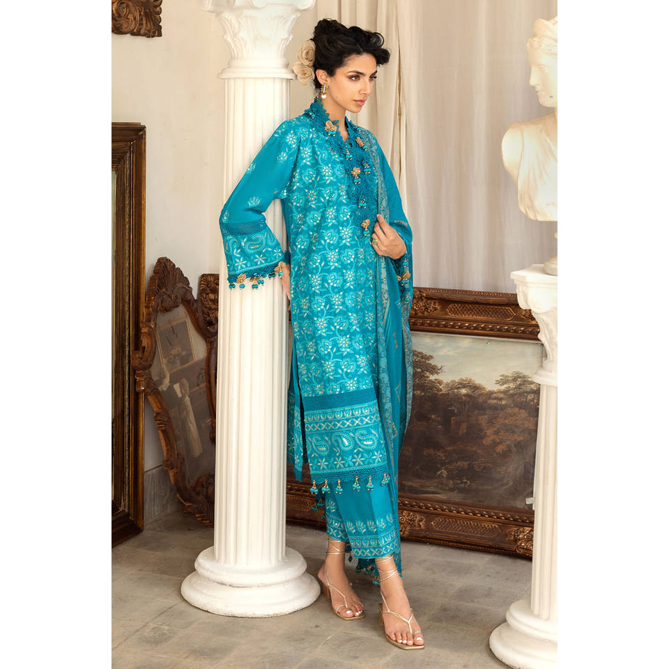 ชุดสูทผ้าลอนปักลายซารีและเลื่อมสำหรับผู้หญิง 3 ชิ้น พร้อมผ้าคลุมไหล่พิมพ์ลายทองและเคลือบเงา รุ่น DN-52042