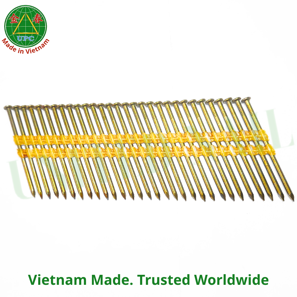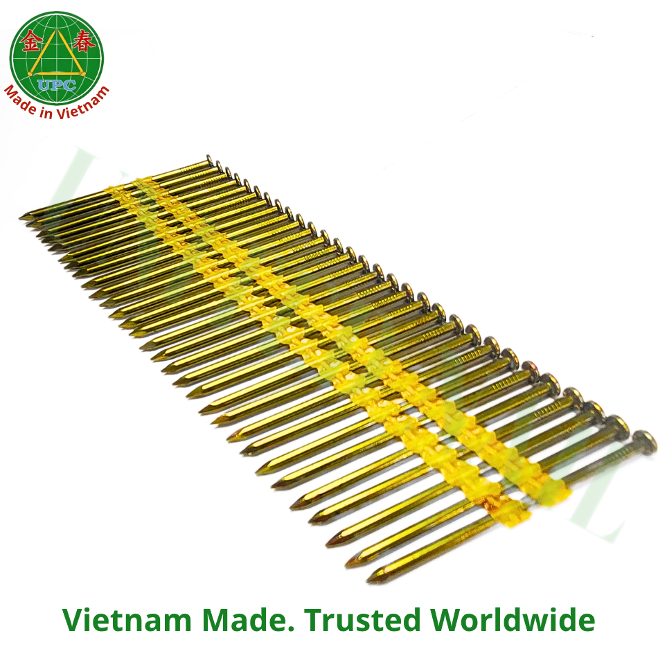 ตะปูพลาสติกขนาด 3 นิ้ว แบบม้วน พร้อมเกลียวเคลือบสีเหลือง สำหรับงานโครงสร้าง จากเวียดนาม | ตะปูในแถบพลาสติก