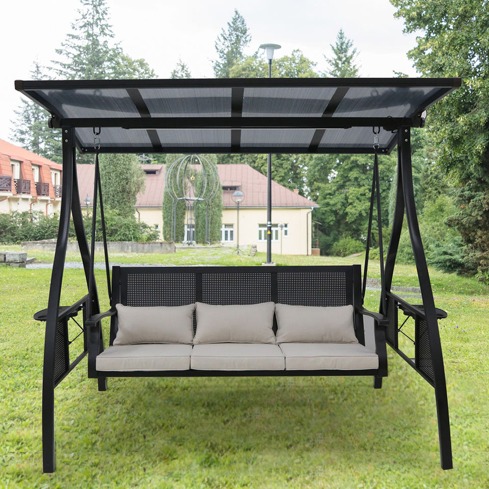 เก้าอี้ชิงช้าระเบียงกลางแจ้ง3ที่นั่งพร้อมโครงเหล็กหลังคาระบายอากาศปรับได้สำหรับสวนหรือห้องนั่งเล่น