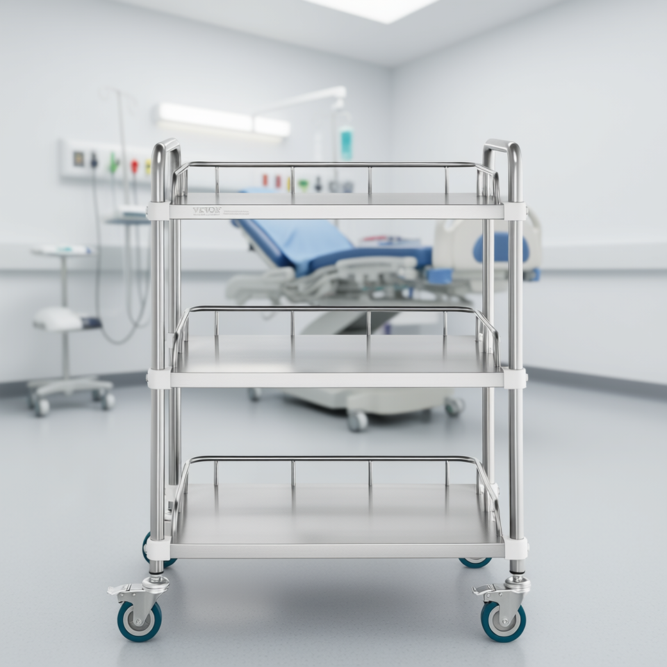 รถเข็นสแตนเลส 3 ชั้น ล้อหมุนได้ ขนาด 26.38x15.55x34.13 นิ้ว สำหรับใช้ในคลินิกทันตกรรมและโรงพยาบาล