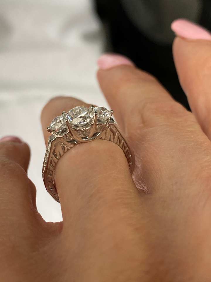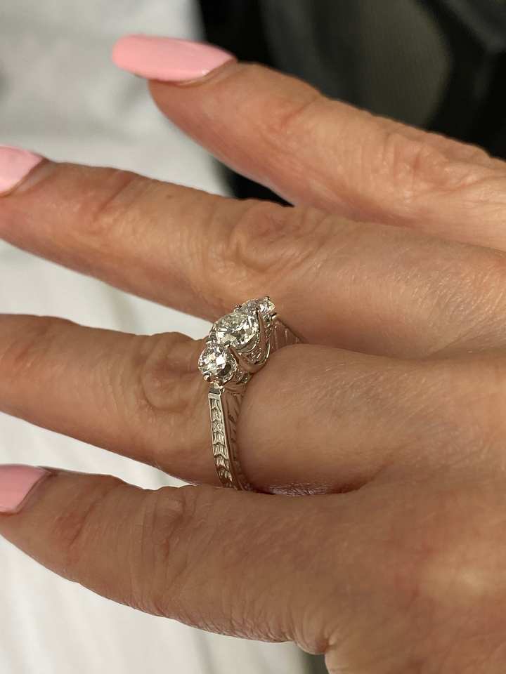 3 Stone Engagement Ring 1.24Ct Round Diamond Three Stone Engagement Ring Vintage Past Present Future Pattern Band 14k White Gold