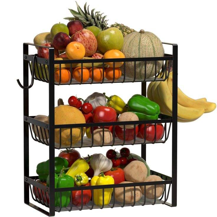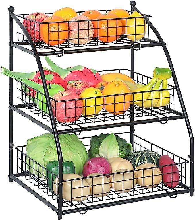 3 Tier Fruit Basket Metal Wire with 4 Banana Hooks Countertop Fruit Vegetable Basket Kitchen Organizer