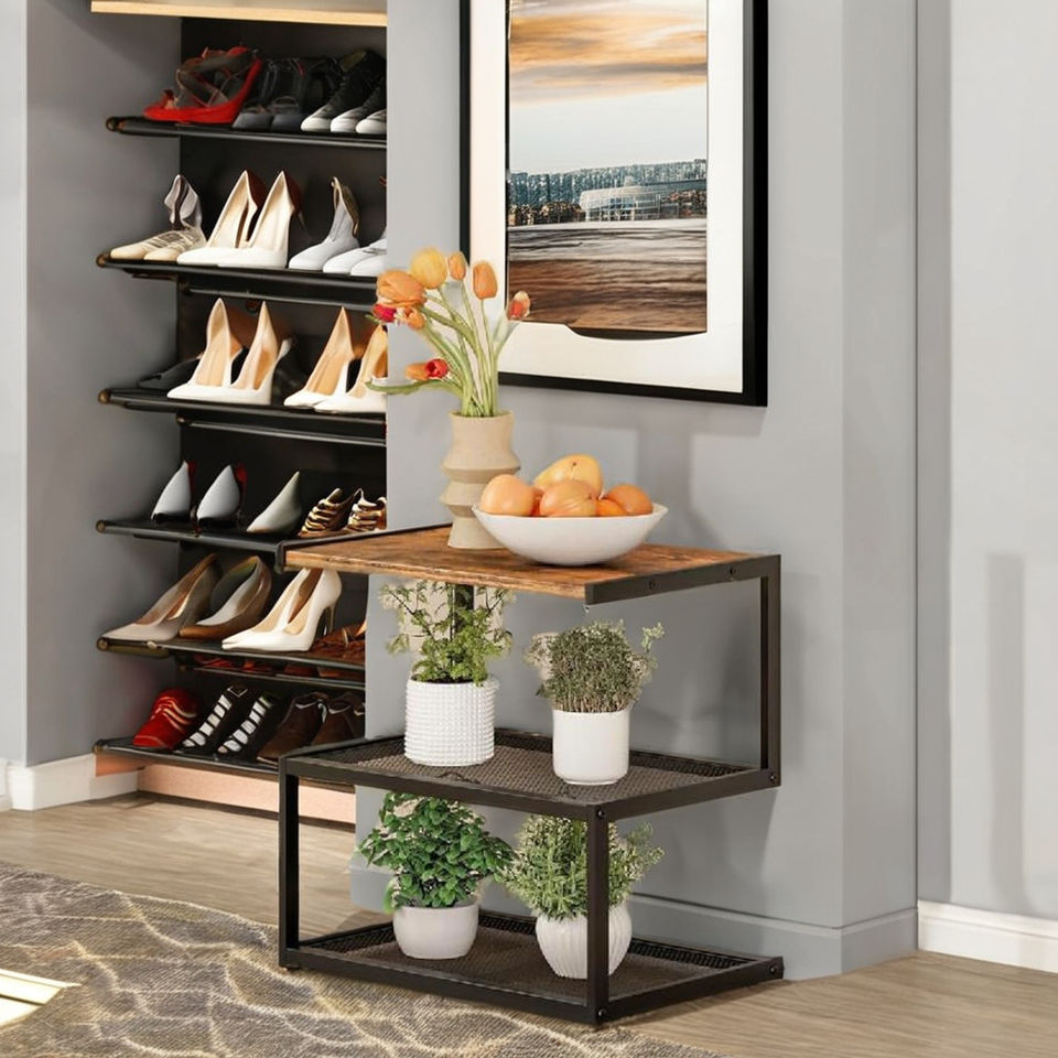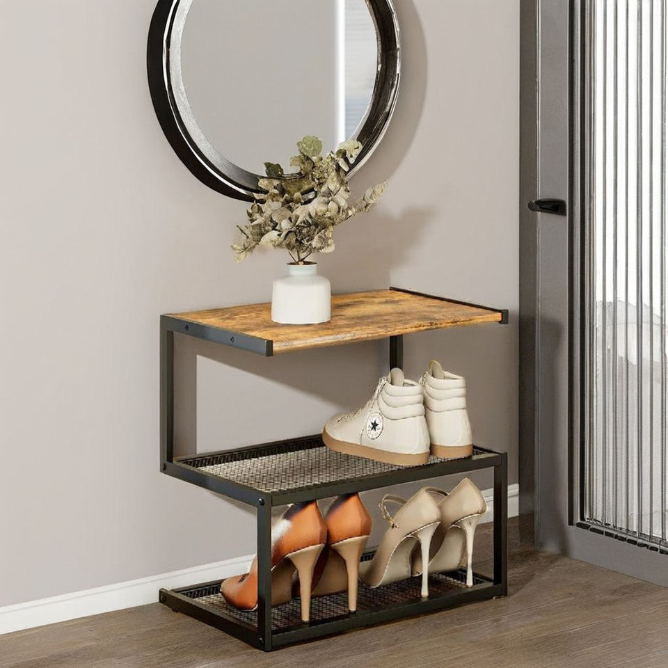 ชั้นวางรองเท้า3ชั้นเก็บของไม้5รูปพร้อมโครงเหล็กชั้นวางของแบบตั้งอิสระสำหรับทางเข้า