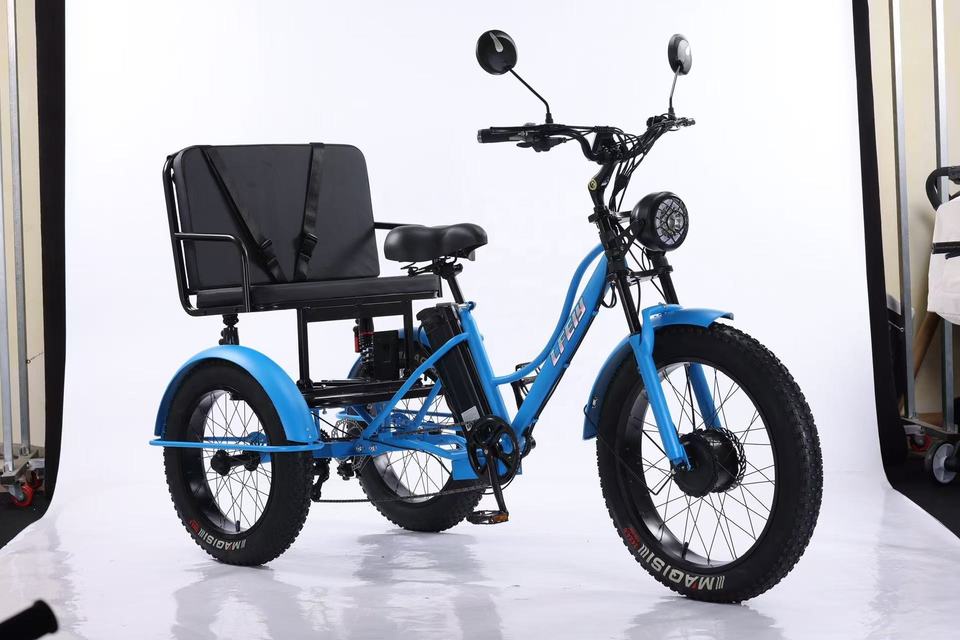 จักรยานสามล้อแบบพับได้ มีเบาะนั่งกว้าง พร้อมมอเตอร์ด้านหน้า สำหรับบรรทุกสัมภาระและมีที่นั่งผู้โดยสาร