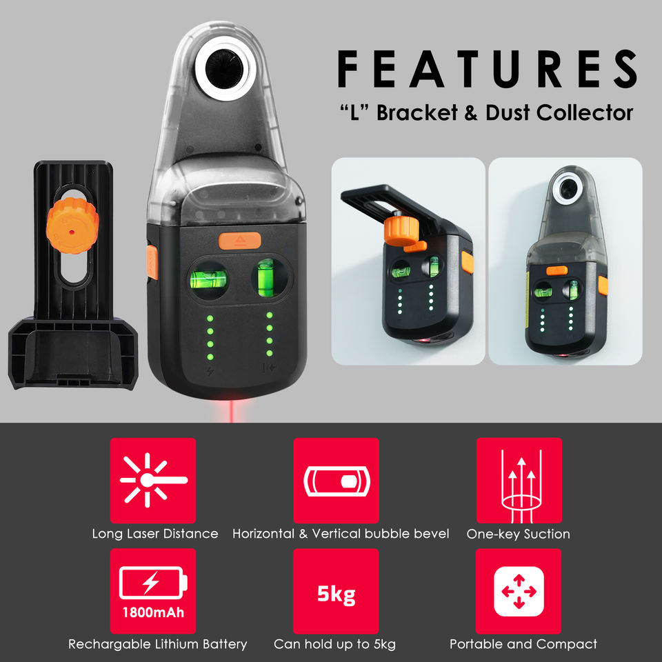 เครื่องมือเลเซอร์ 3-in-1, เครื่องดูดฝุ่นสำหรับงานเจาะ และแท่นวางเลเซอร์พร้อมตัวยึดติดผนังแบบสุญญากาศเพื่อการใช้งานที่สะดวก (OEM)
