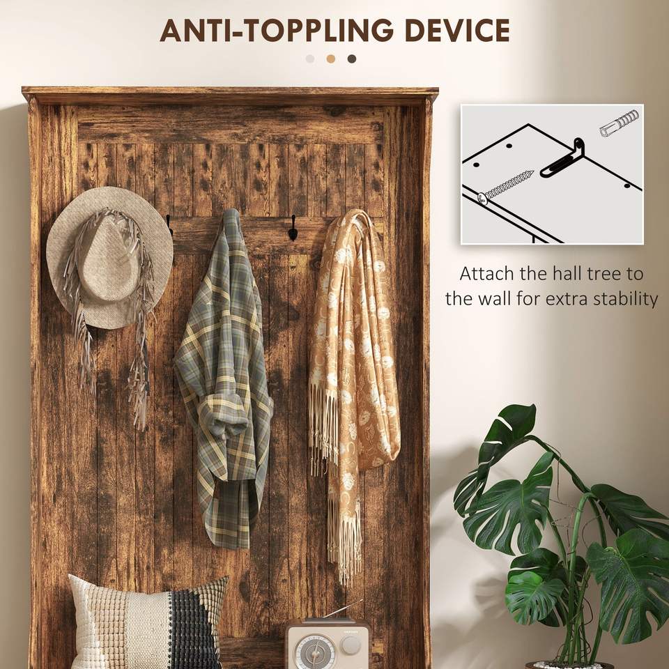 ม้านั่งทางเข้าบ้านแบบ 3-in-1 สีน้ำตาลสไตล์เรโทร พร้อมราวแขวนเสื้อโค้ท ตู้เก็บรองเท้า และตะขอแขวน 5 อัน สำหรับโถงทางเดิน