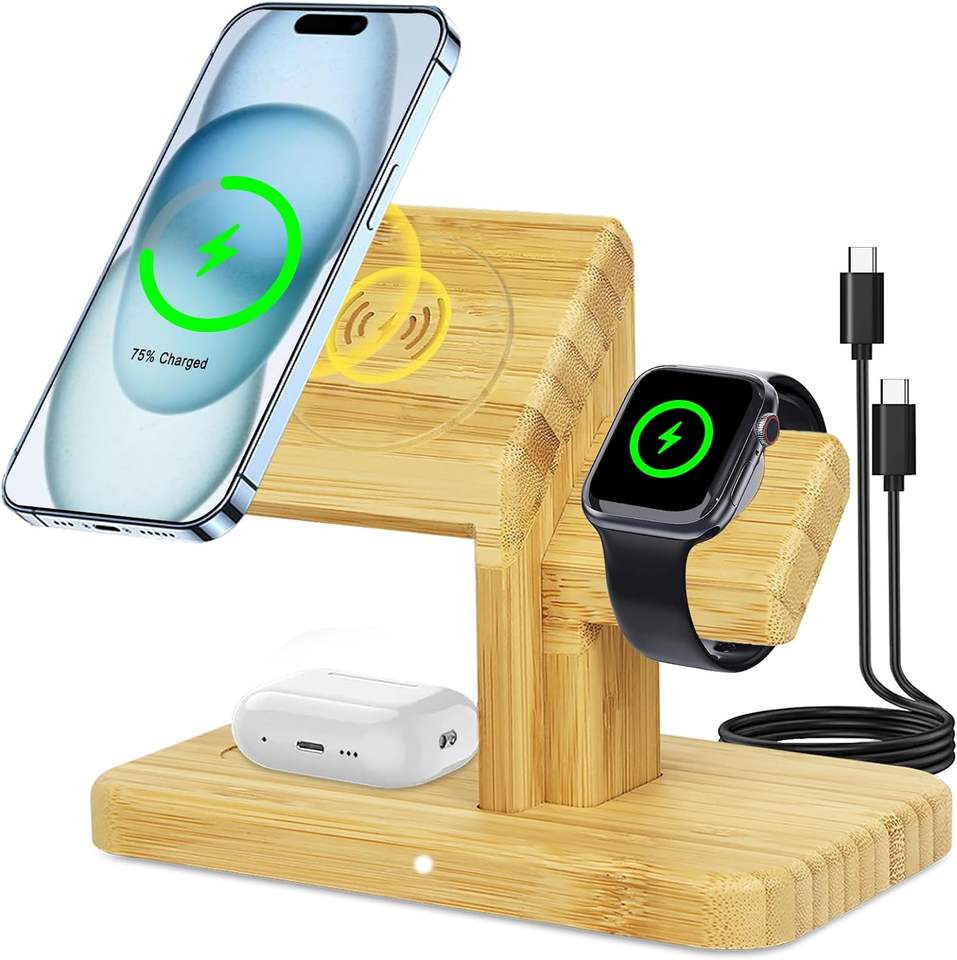 แท่นชาร์จไร้สาย 3 in 1 กำลังไฟ 20W ชาร์จเร็วแบบแม่เหล็ก วัสดุไม้ไผ่ สำหรับ iPhone 17/16/15/14/13/12 Pro/Max/Plus/นาฬิกา/Airpods
