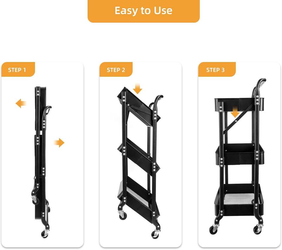 รถเข็นแบบพับได้3ชั้นมีล้อเก็บของอเนกประสงค์พับได้สีดำราคาโรงงาน