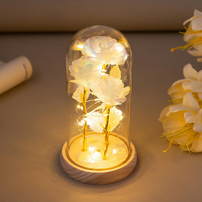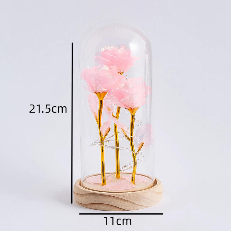 ดอกกุหลาบทองคำเปลว 3 ดอก พร้อมฝาครอบแก้ว ดอกไม้อมตะ ไฟกลางคืน ของขวัญวันแม่ วันวาเลนไทน์ ของตกแต่ง