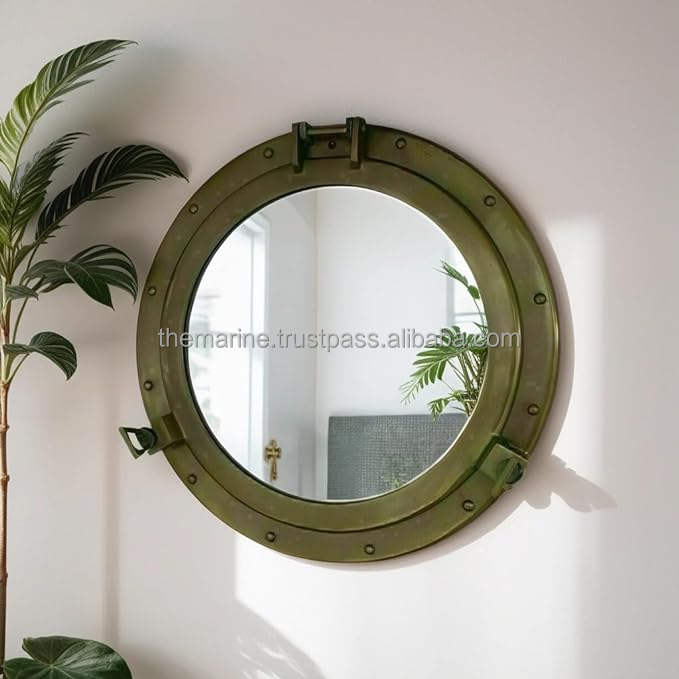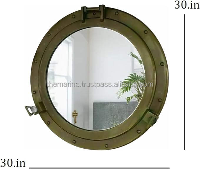กระจกทรงกลมโบราณสีทองเหลืองขนาด 30 นิ้ว กระจกตกแต่งผนังสไตล์เรือเดินสมุทร ดีไซน์ใหม่ ขนาดใหญ่