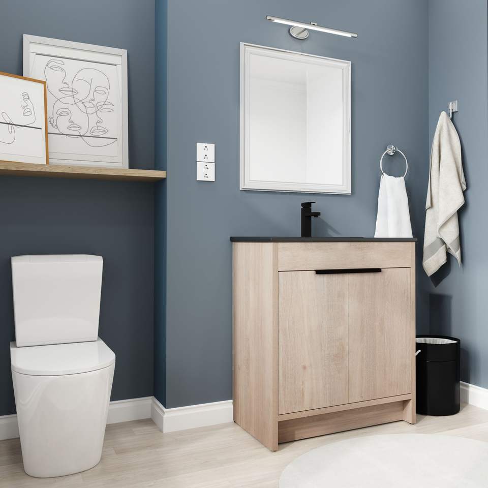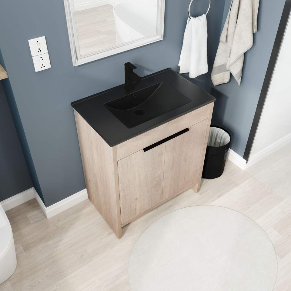 ตู้ห้องน้ำแบบตั้งพื้นขนาด 30 นิ้ว พร้อมอ่างเซรามิกสีดำและบานตู้ปิดแบบนุ่มนวล 2 บาน รุ่น W1286S00019 (BVB02430PLO BL9075BK)