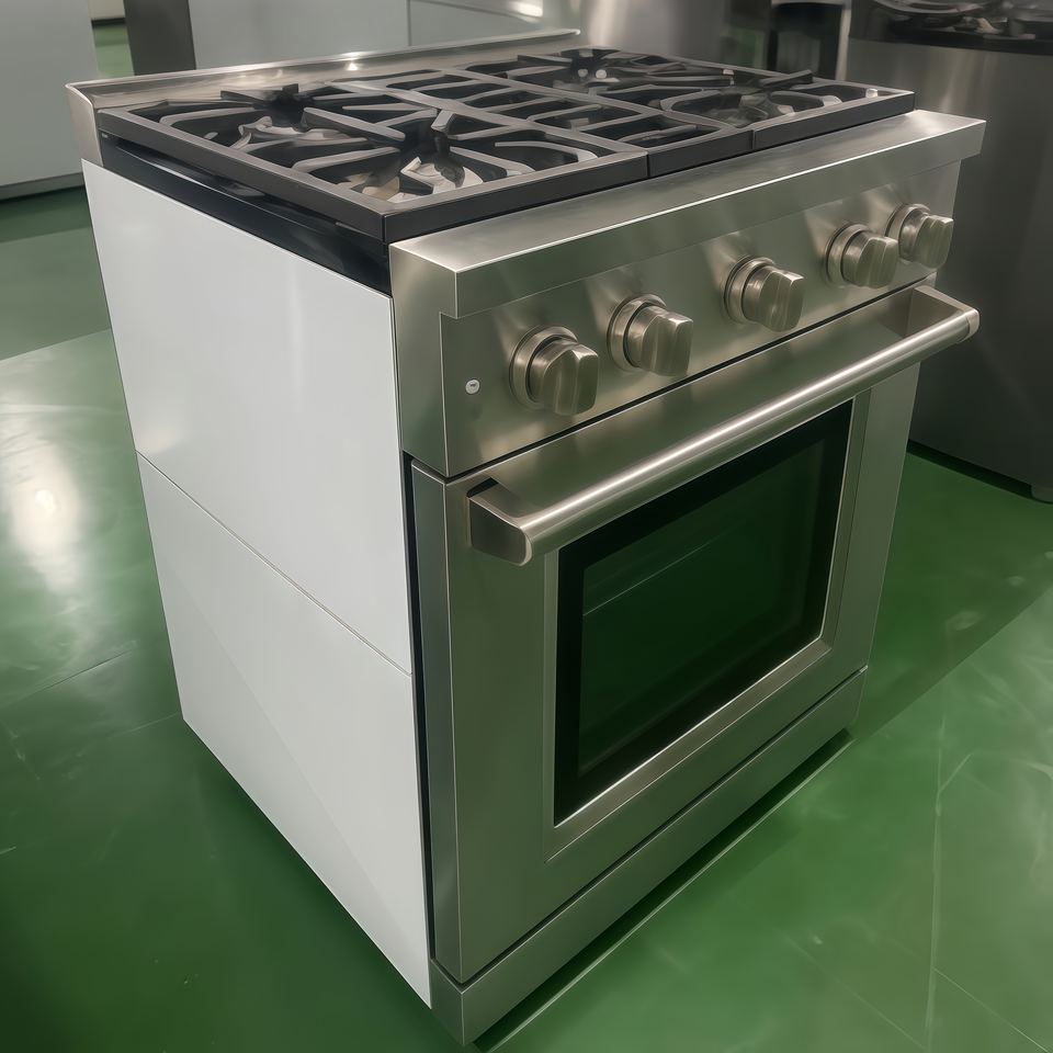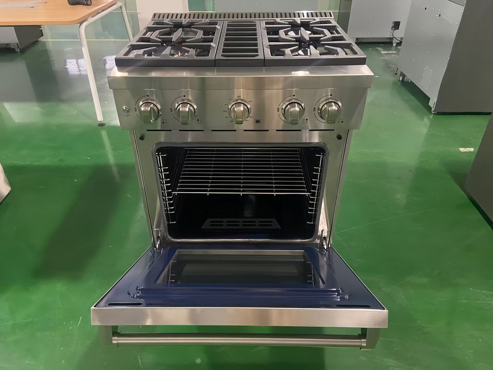 เตาแก๊สสเตนเลสแบบพาความร้อน ขนาด 30 นิ้ว 4 หัวเตา ความจุ 4.63 คิว เตาอบแบบตั้งพื้น ประตูกระจกสามบาน สำหรับใช้ในครัวเรือน