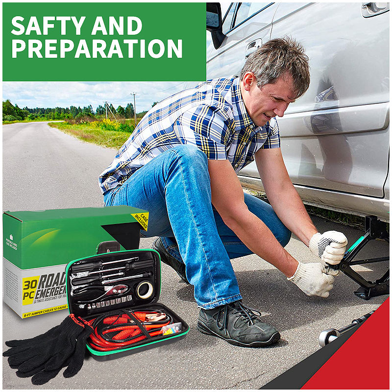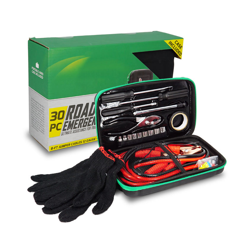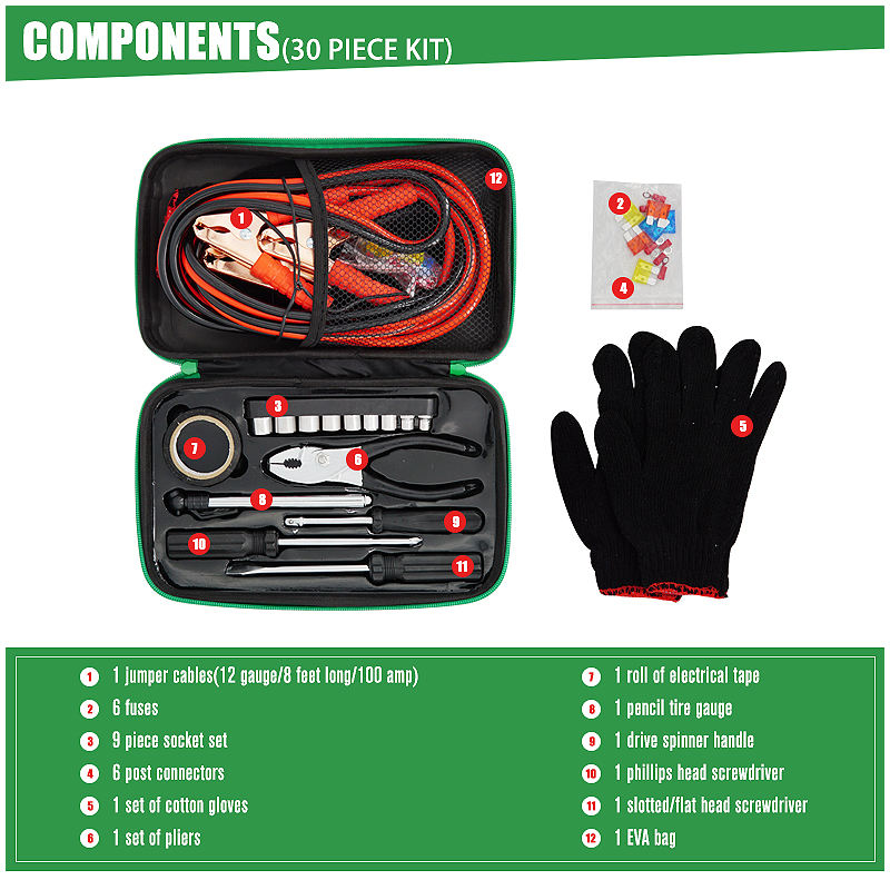 ชุดเครื่องมือฉุกเฉินในรถยนต์ 30 ชิ้น พร้อมสายจั๊มพ์แบตเตอรี่และกระเป๋า EVA สำหรับการซ่อมแซมและช่วยเหลือฉุกเฉินอย่างรวดเร็ว