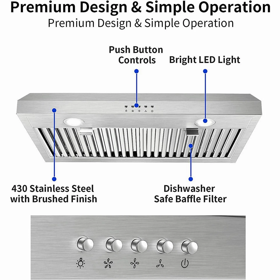 เครื่องดูดควันในครัวขนาด 30 นิ้ว แบบติดตั้งใต้ตู้ 3 ระดับความเร็ว 600 CFM พร้อมระบบระบายอากาศ