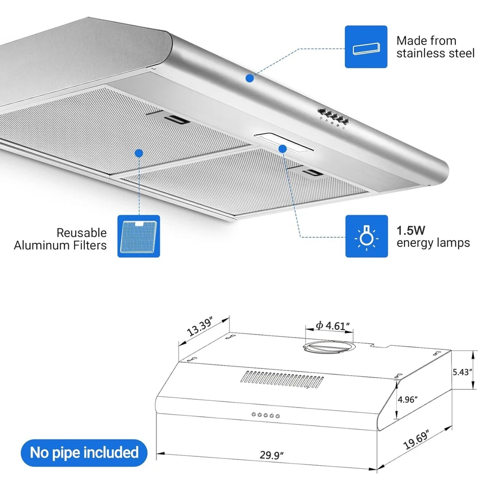 เครื่องดูดควันแบบติดตั้งใต้ตู้ขนาด 30 นิ้ว แบบไร้ท่อ แบบไร้สาย แบบเหล็ก 3 ระดับความเร็ว
