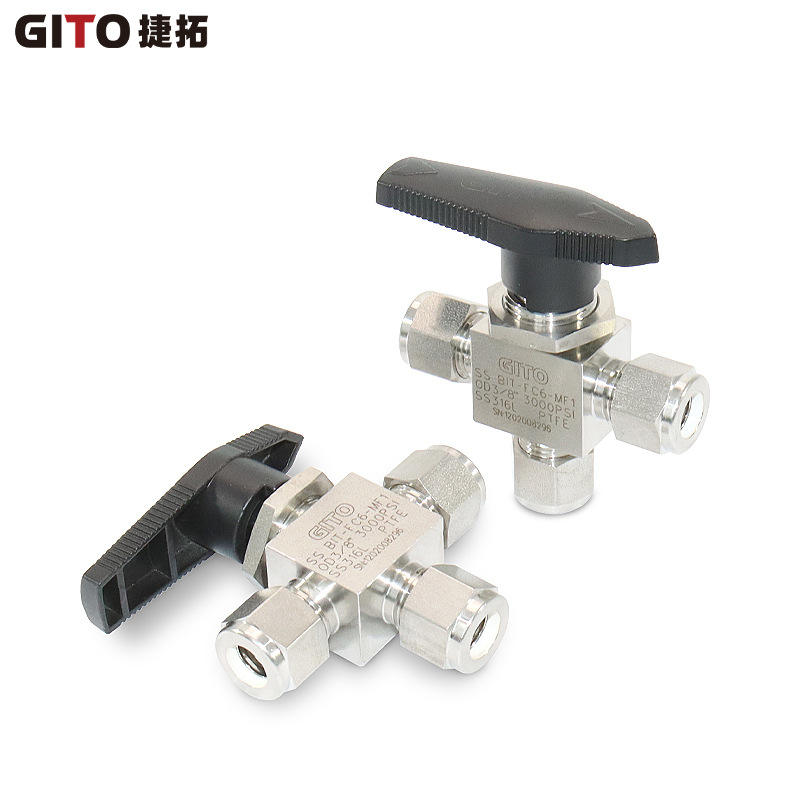 วาล์วบอลสามทางแบบอินทิเกรตแรงดันสูง 3000PSI ทำจากสแตนเลส 316L พร้อมข้อต่อแบบอัด